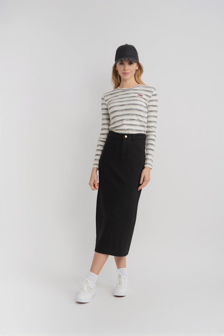 Teens long sleeve ribbed distressed striped top with center back merrow edge. ֲAvailable in the following colors: