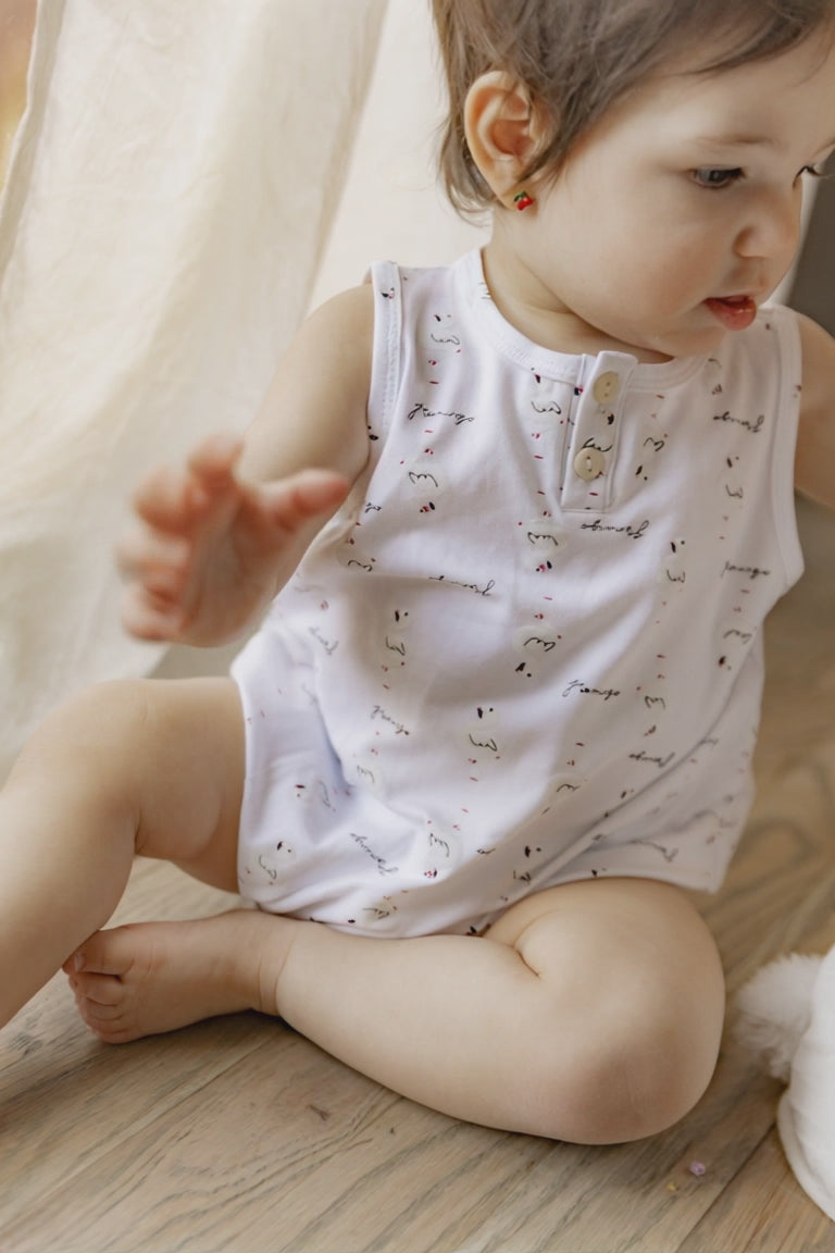 Girls cotton spandex, allover flamingo print romper with snap opening at bottom. ֲ