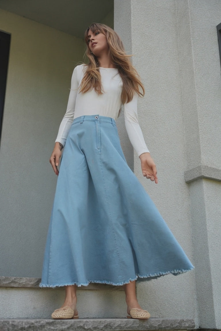 Ladies maxi denim A-line fringe skirt with metal zipper button closure at front with belt loops. ֲ