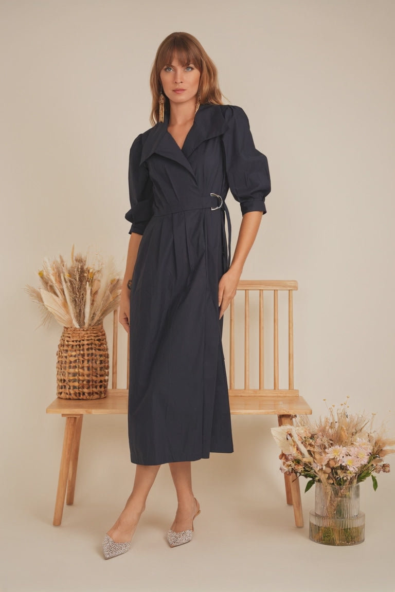 Ladies 3/4 sleeve cotton midi wrap dress with elastic at back waist, side pocket and metal belt hoop at left side waist. ֲ