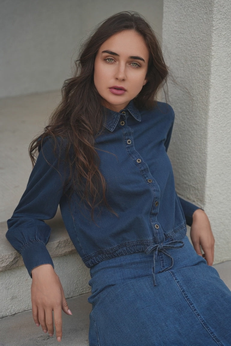 Ladies long sleeve denim henley bungee top with center front metal button opening and self string through hem. ֲ