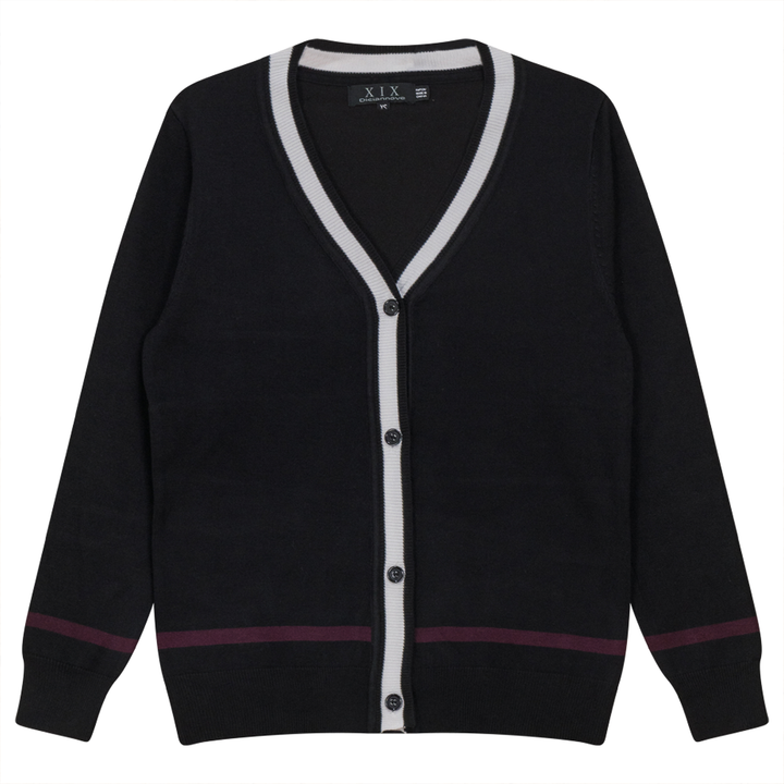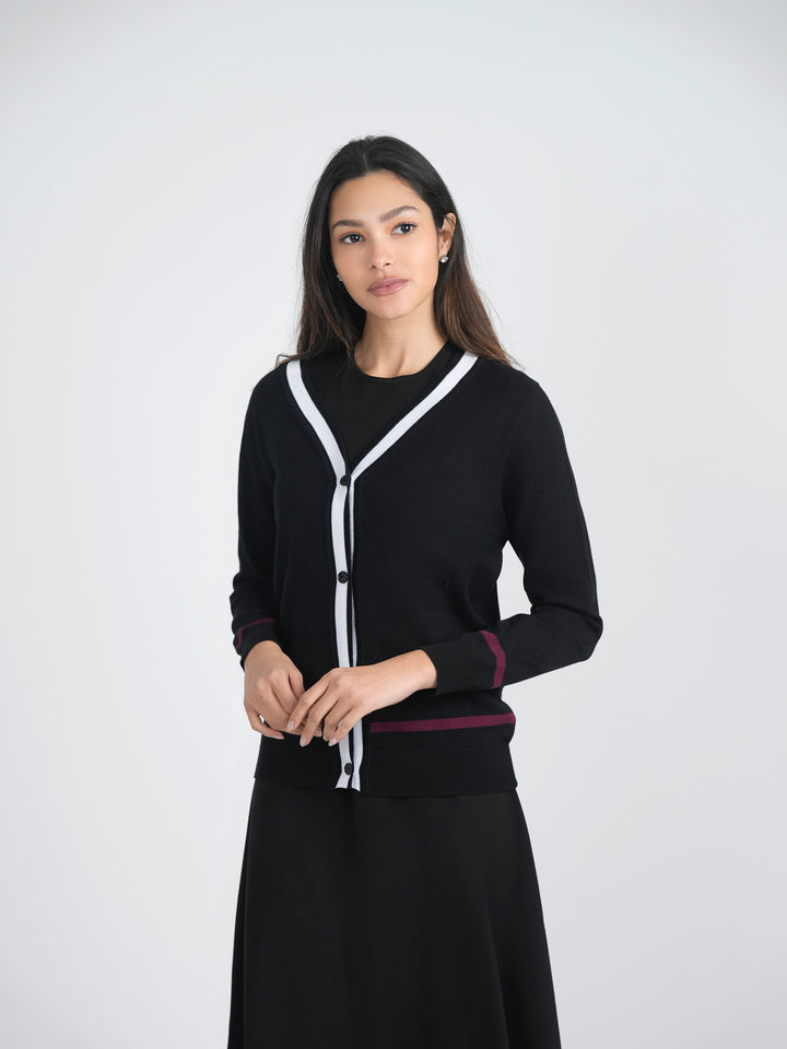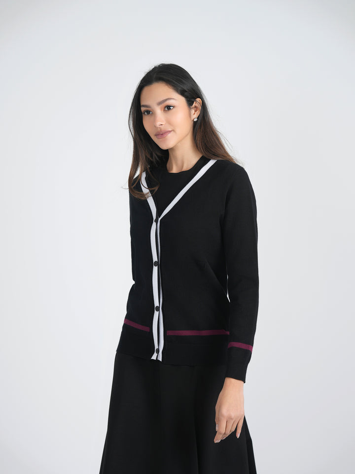 Ladies knit contrast cardigan with ribbed neck band,cuffs and hem and placket with button closure at center front. ֲ