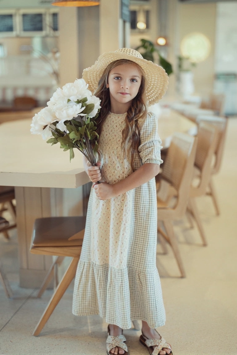 Introducing the Girls Plaid Maxi Dress with Lace Trim- a stunning piece featuring an intricate flower print woven l...