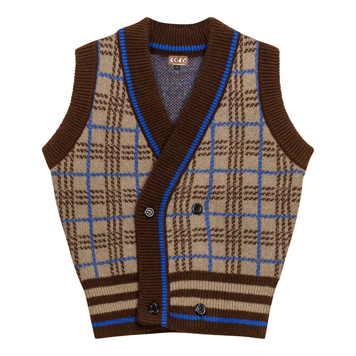 Gilet croisé en tricot à carreaux pour femme avec ouverture boutonnée au centre sur le devant et ourlet rayé contrasté.