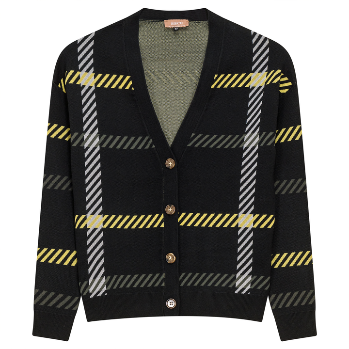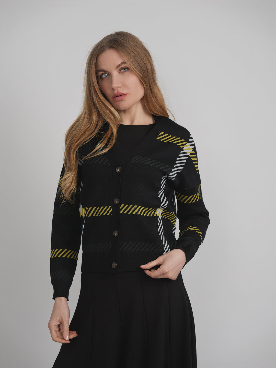 Cardigan en tricot imprimé à manches longues pour femme avec ouverture boutonnée au centre sur le devant et poignets côtelés.