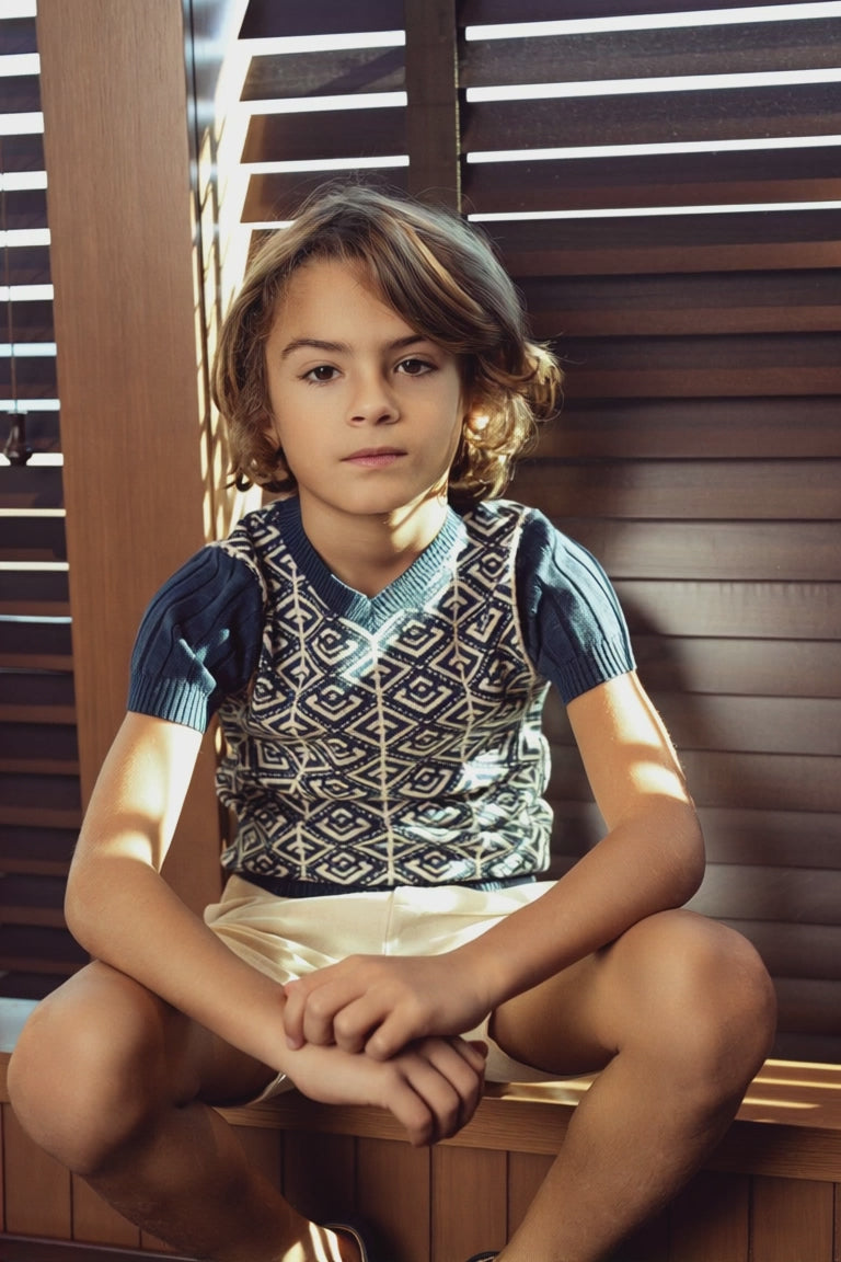 Pull en tricot texturé à losanges à manches courtes et col en V pour garçon avec manches et ourlet côtelés.