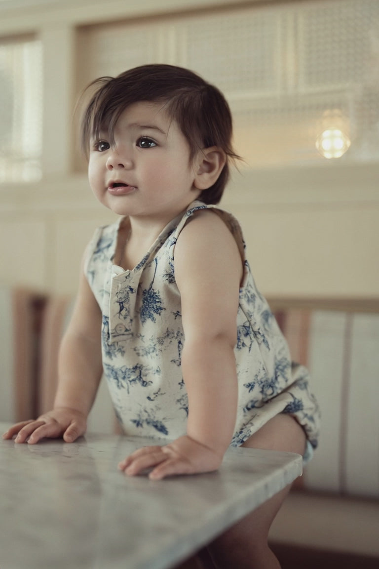 Baby girls linen allover tree print romper with buttons at front placket and snap opening at bottom. ֲ