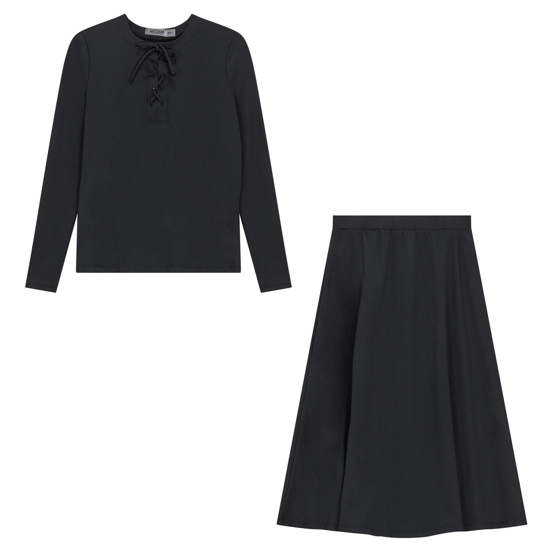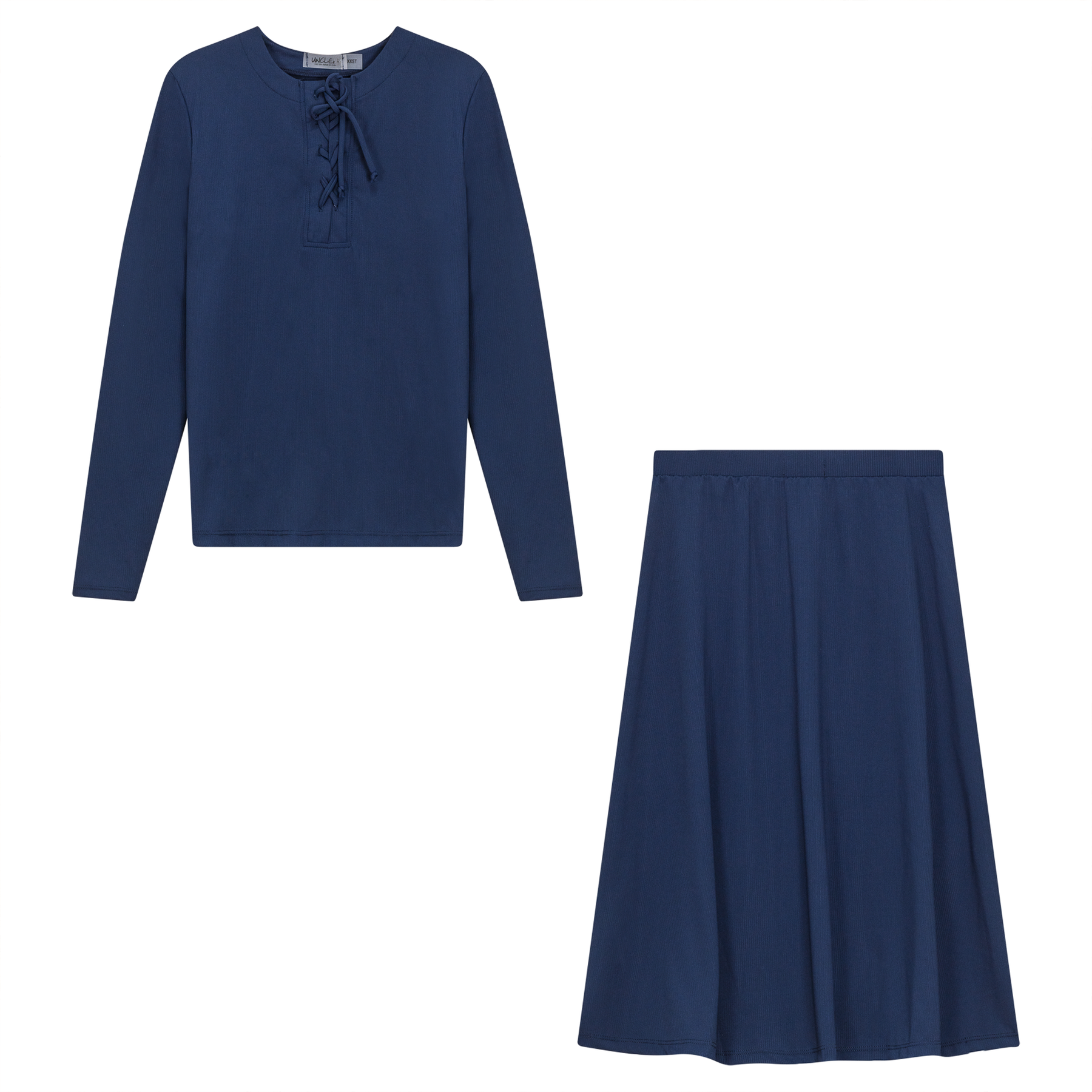Teen 2 piece swim set. Long sleeve top with tubular straps with fake opening at center front. Matching a-line skirt w...