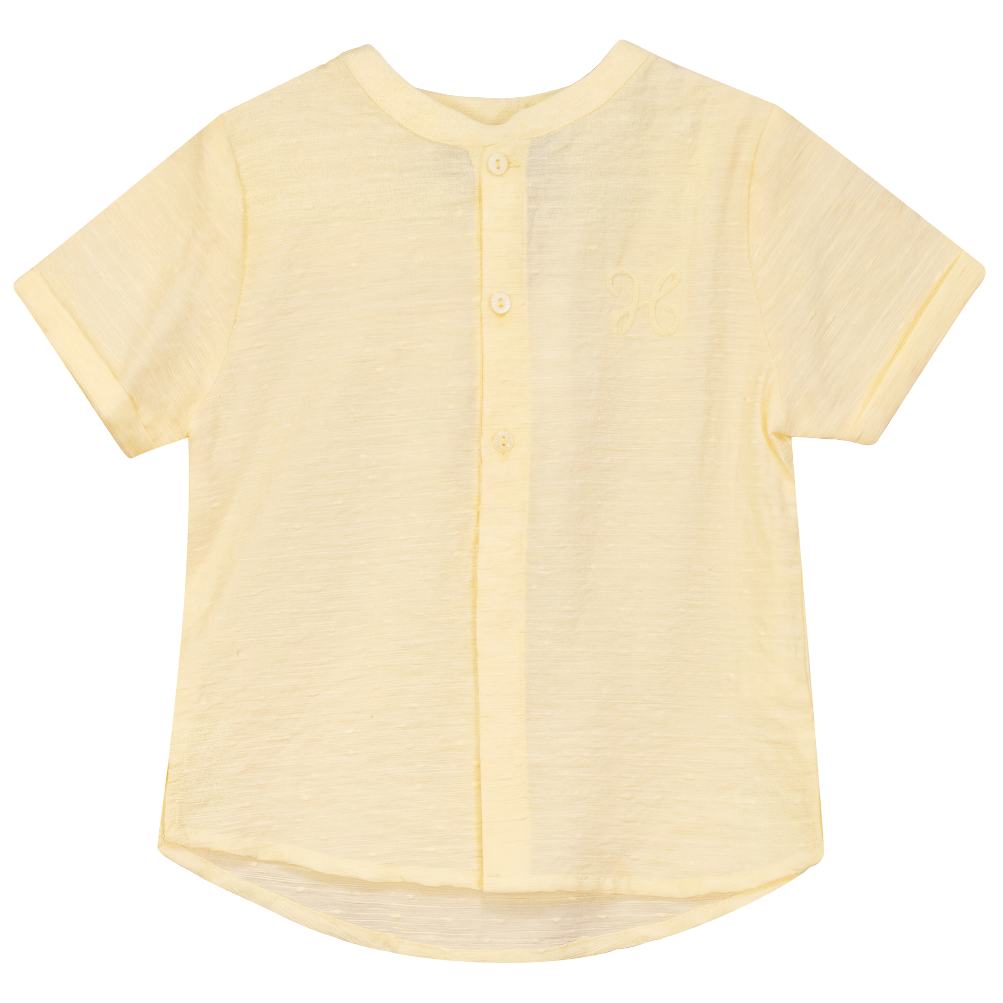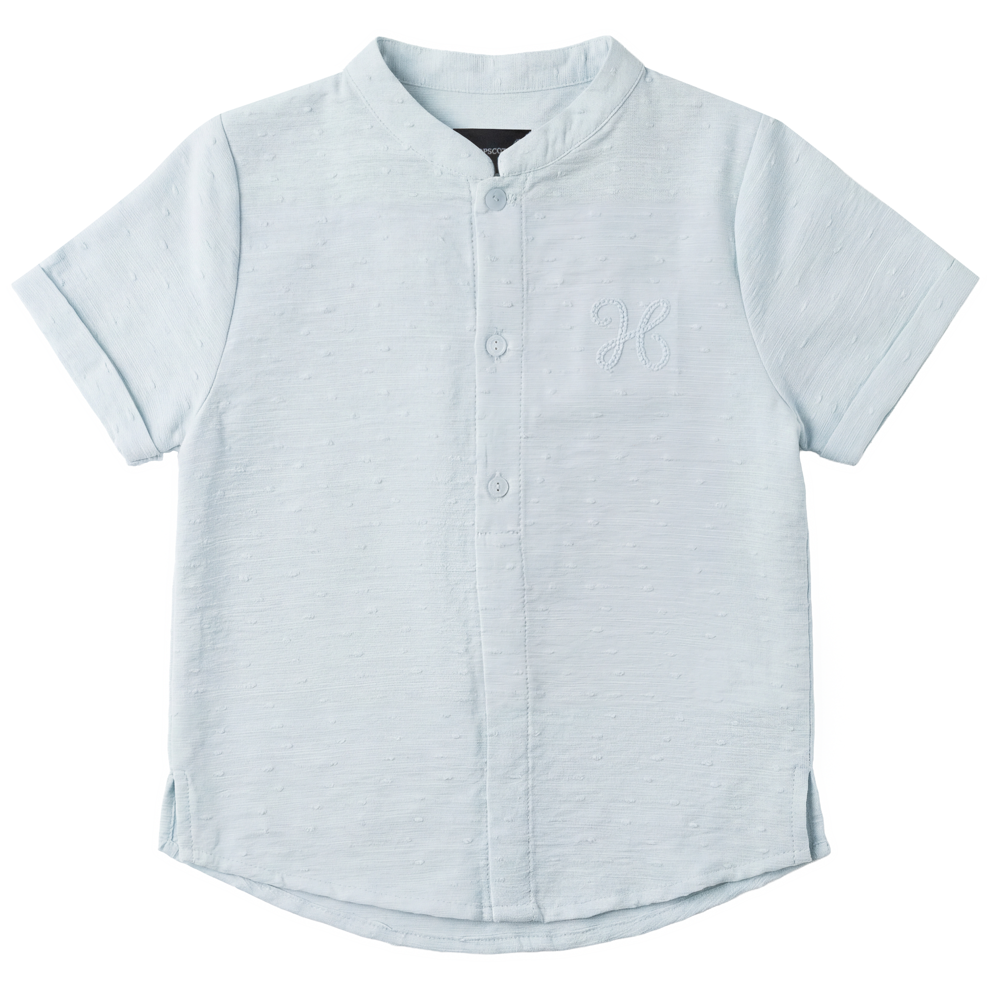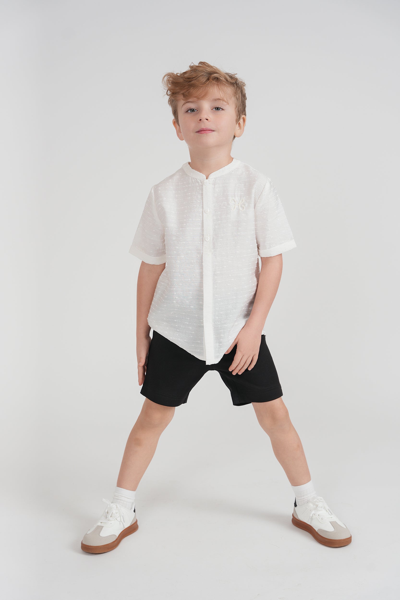 Boys textured woven cotton shirt featuring a soft rounded neckline with a collar insert and subtle chest embroidery. Designed with a center front button placket, short sleeves with folded cuffs, side slits, and a box pleat at the back.ֲ