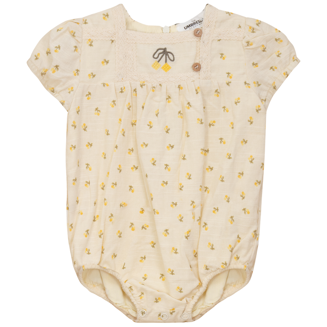 Baby girls allover cherry linen bubble with center front cherry embroiderey, cotton lace neckline, center back invisble zipper closure and snap opening at bottom. ֲ