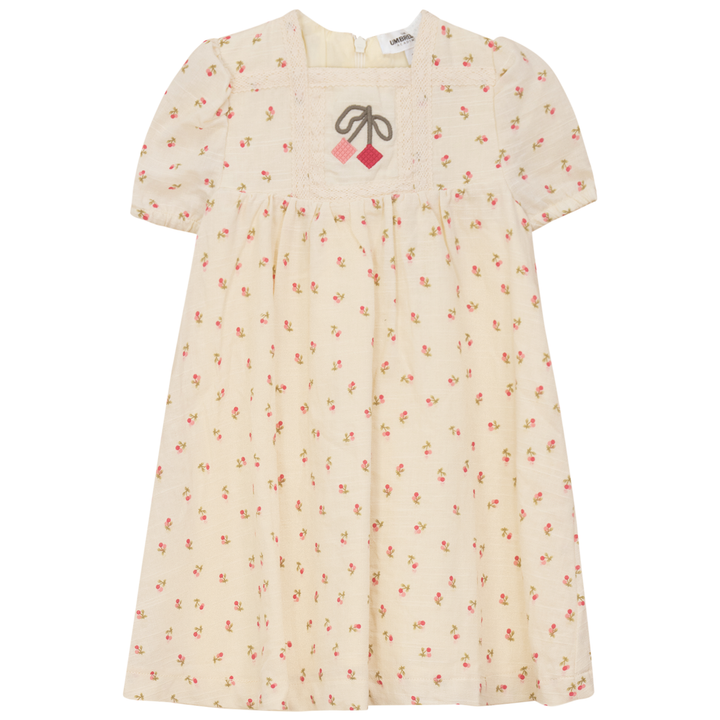 Girls allover cherry printed linen dress with center front cherry embroidery,cotton lace neckline and center back inviisble zipper closure. 3/4 sleeves from size 4 and up.ֲ