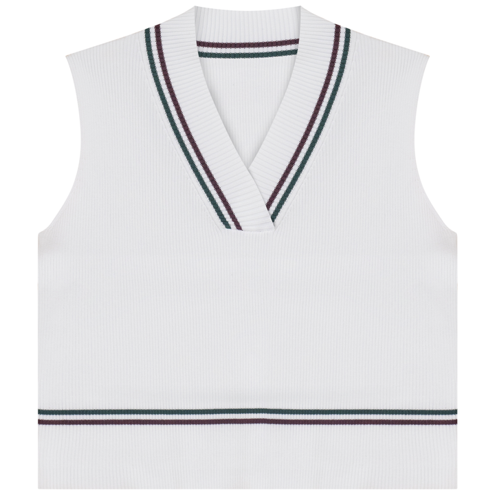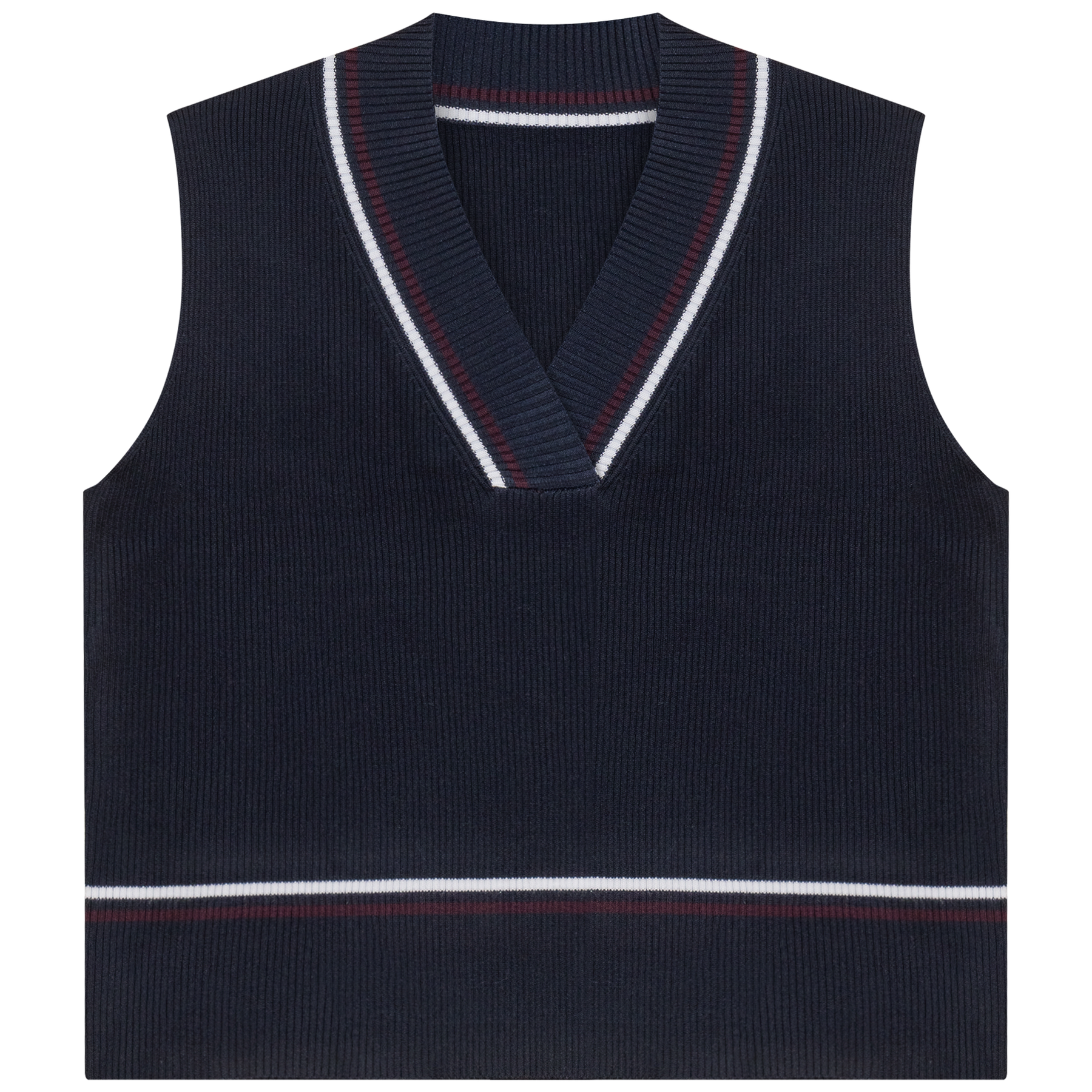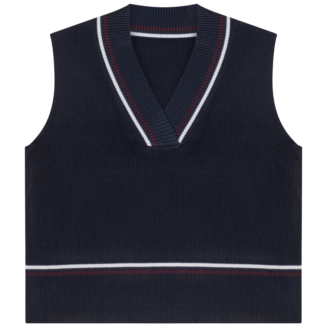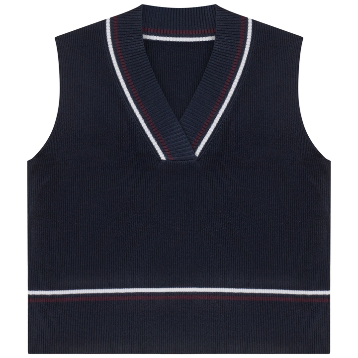 Ladies rib knit vest with contrast stripes at neckband and hemband. ֲ