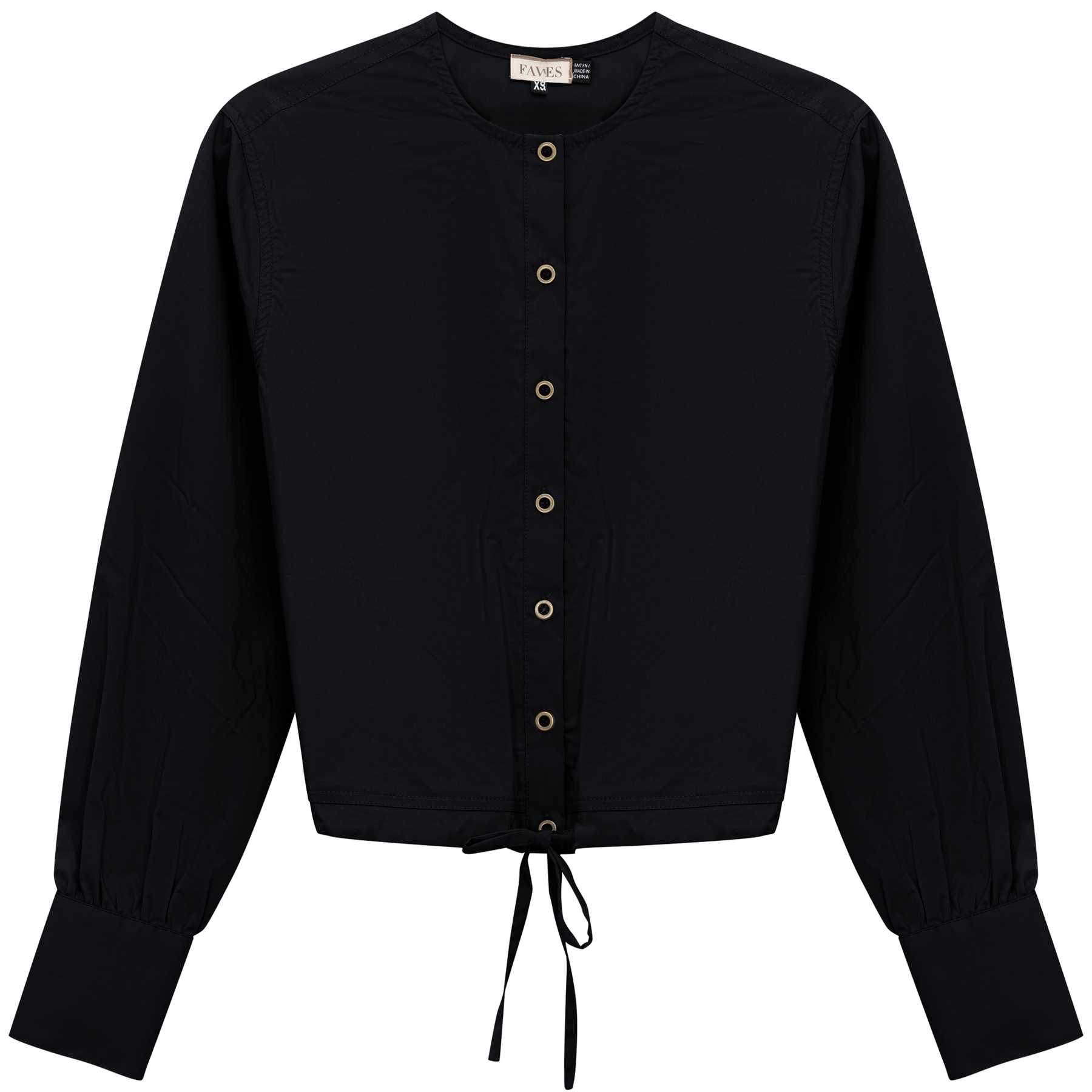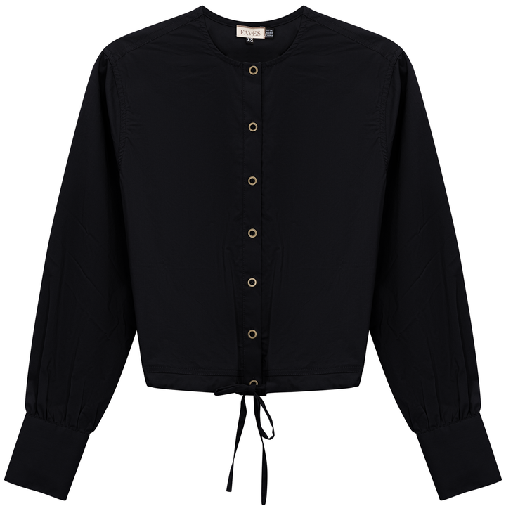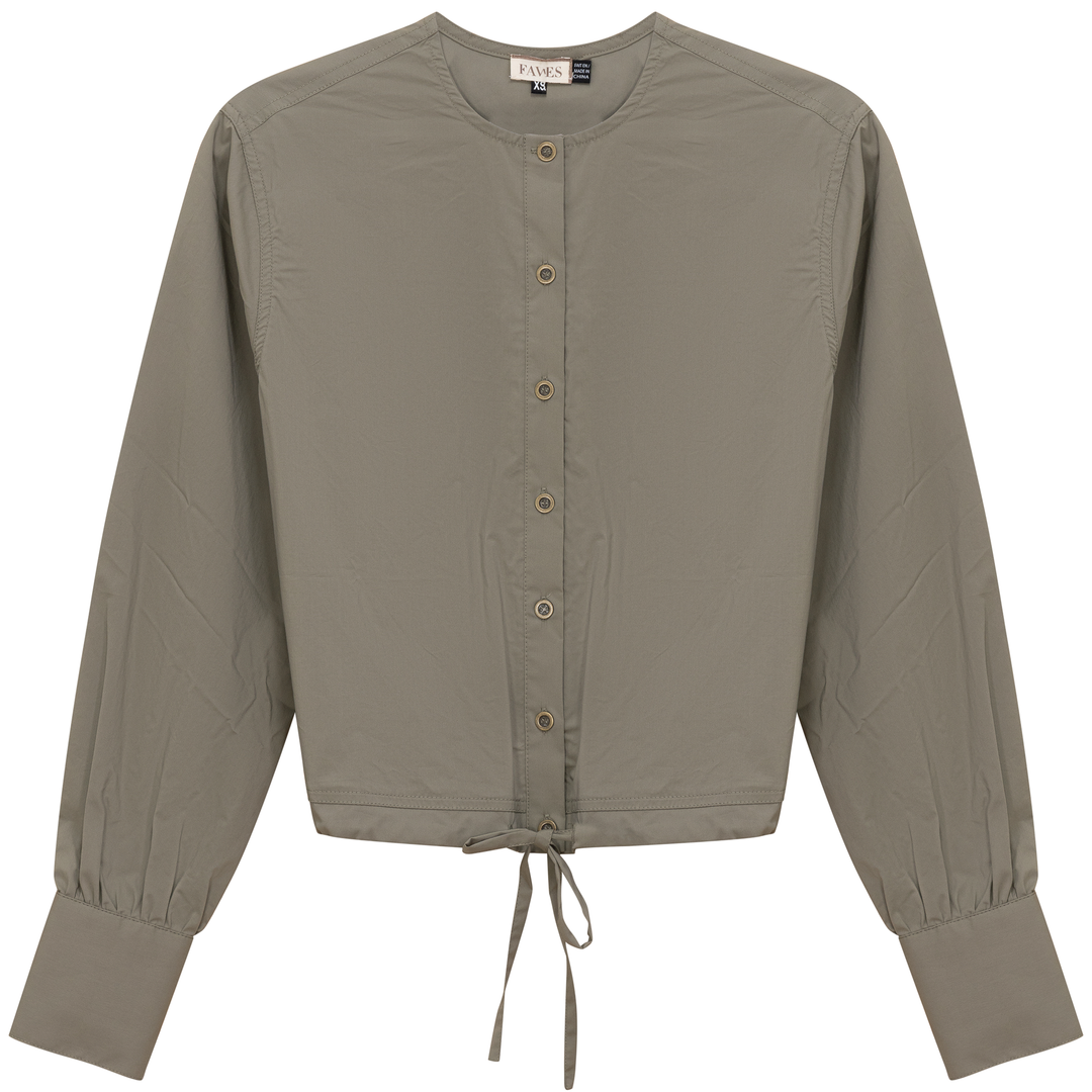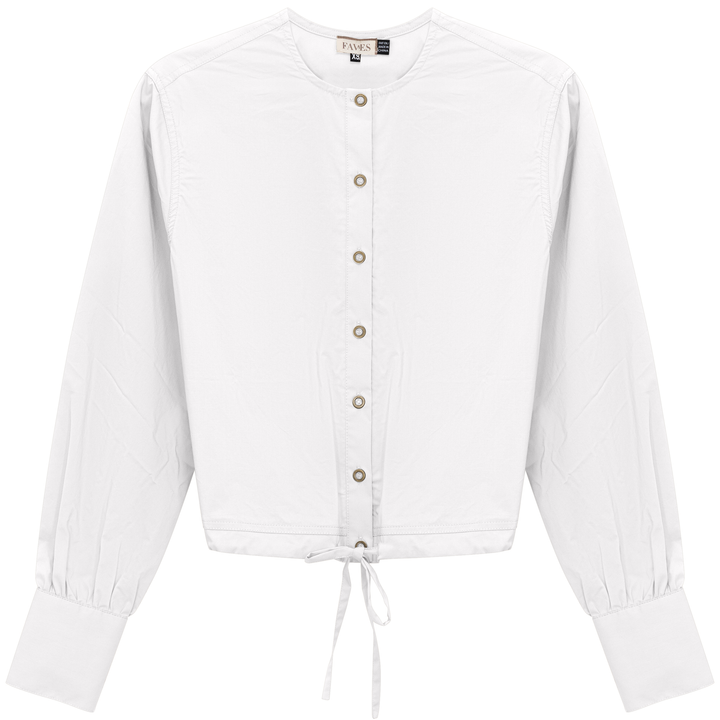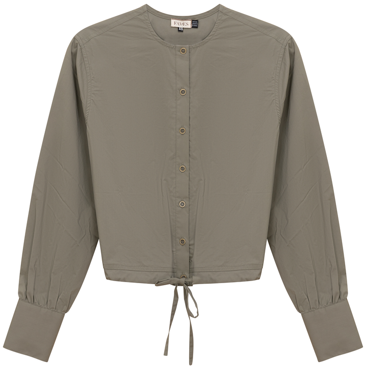 Ladies long sleeve cotton bungee blouse with center front metal button opening and drawstring through hem. ֲ