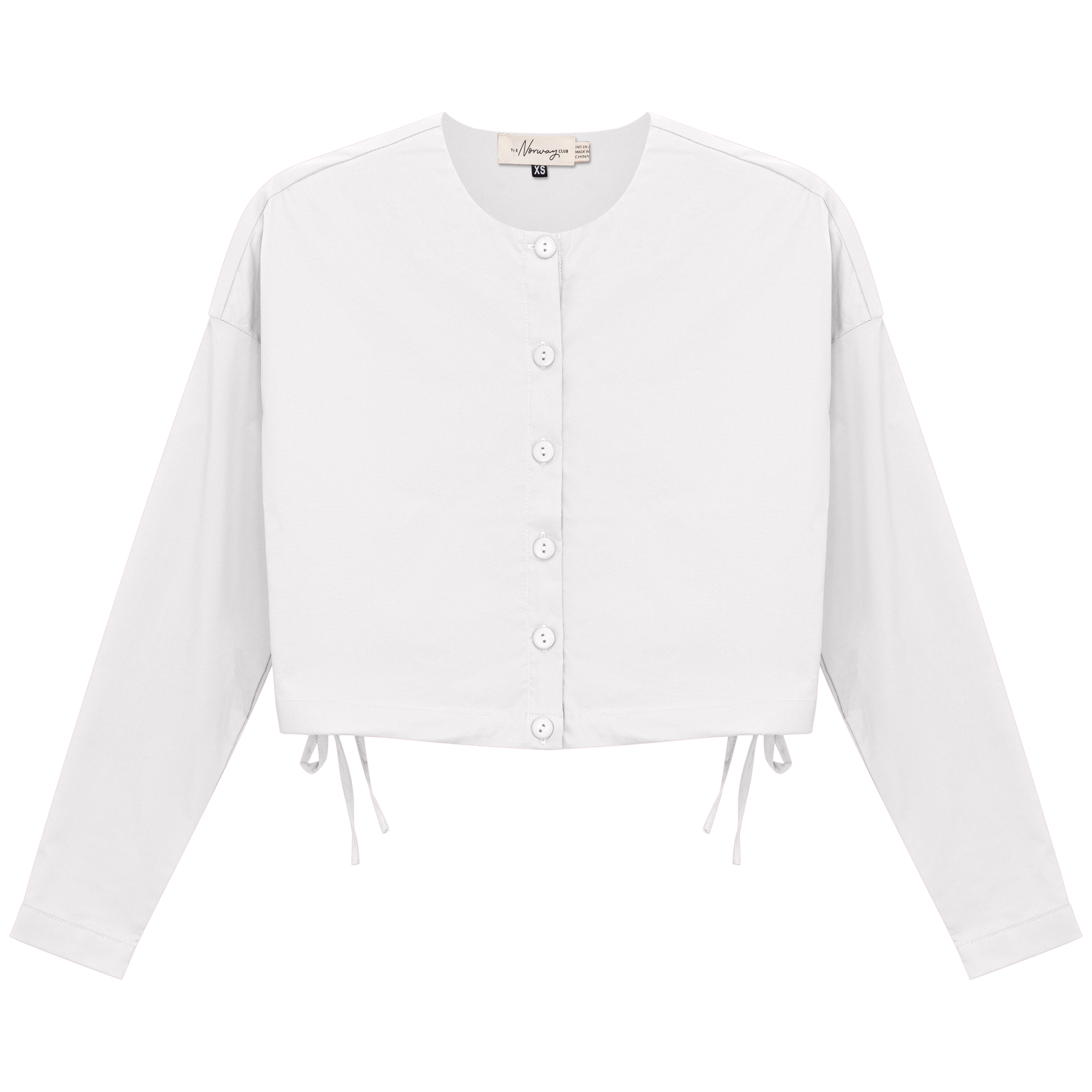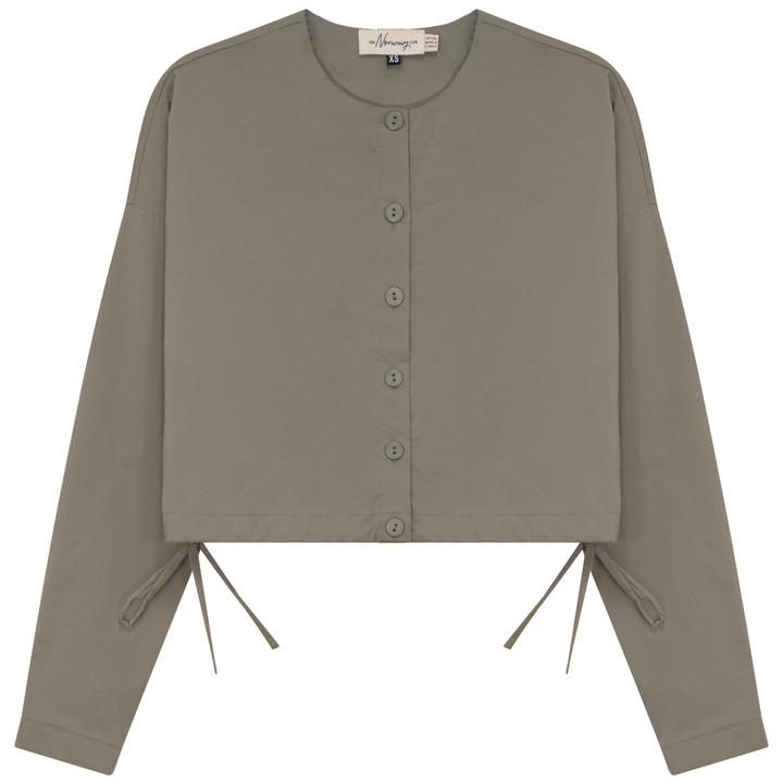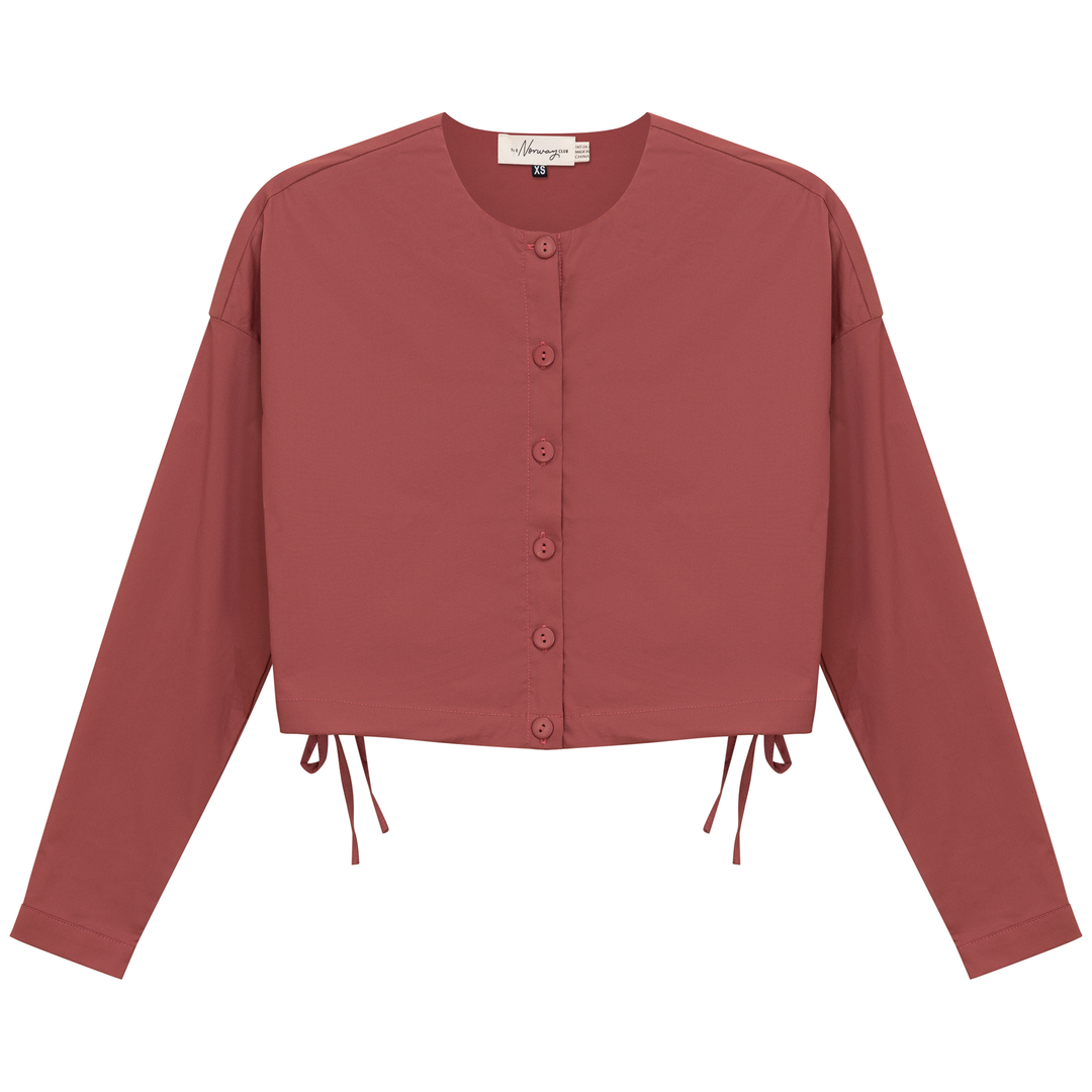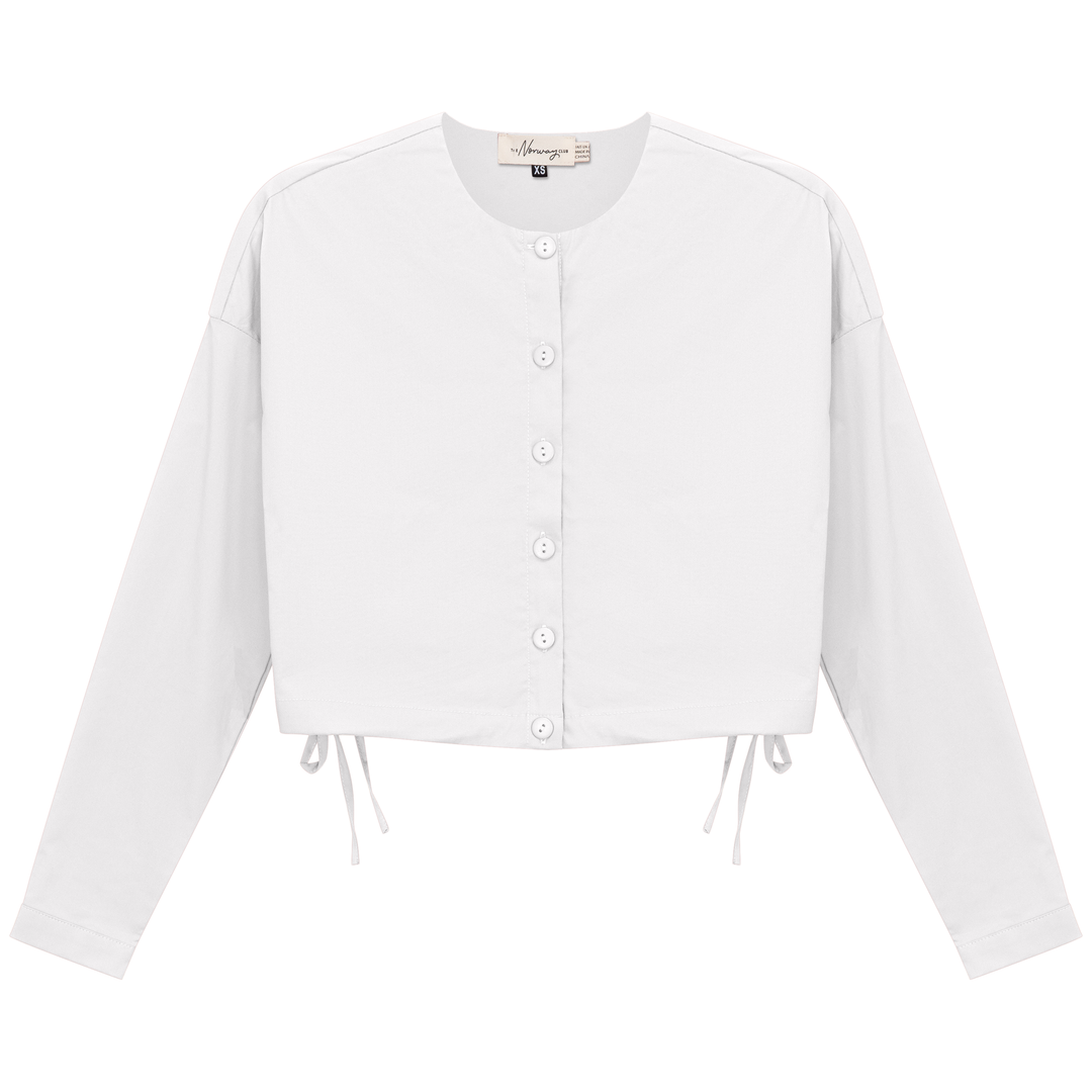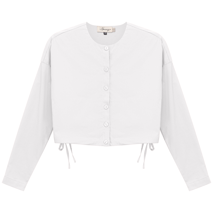 Ladies long sleeve cotton cropped blouse with center front button opening and side bungee tie. ֲ