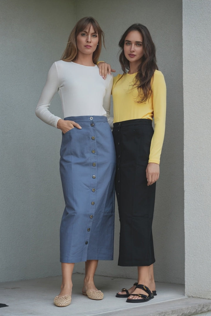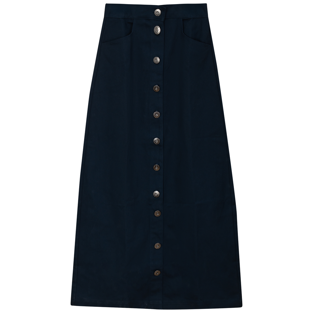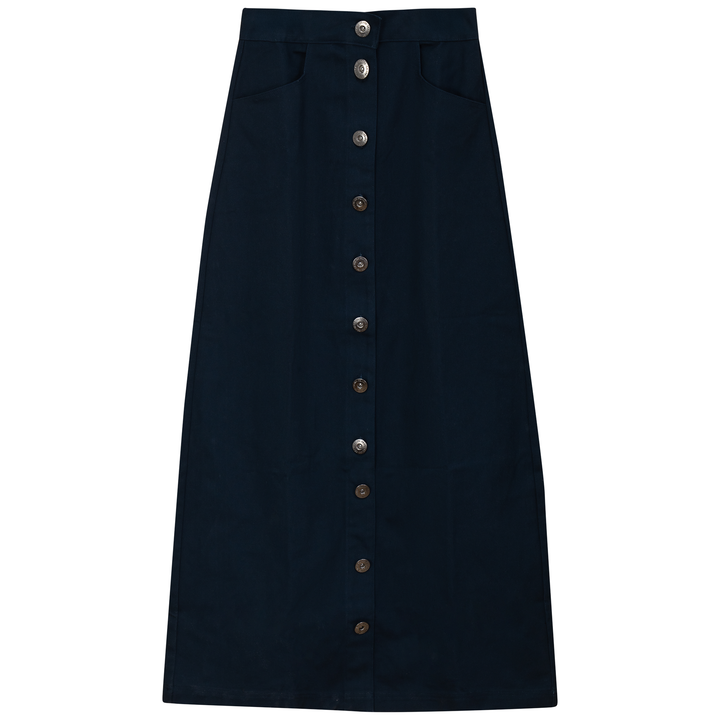 Ladies cotton maxi button down skirt with welt pockets at front.ֲAvailable in the following colors: