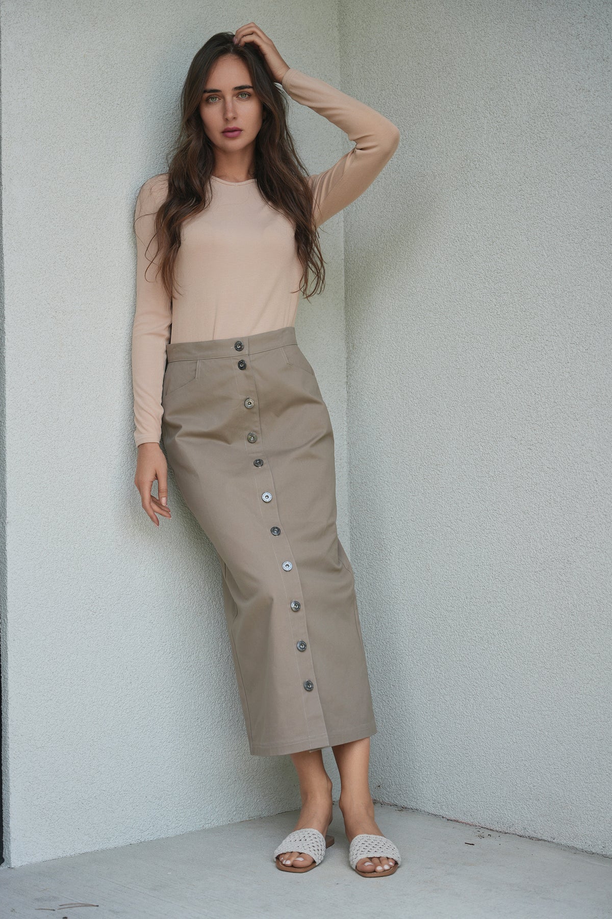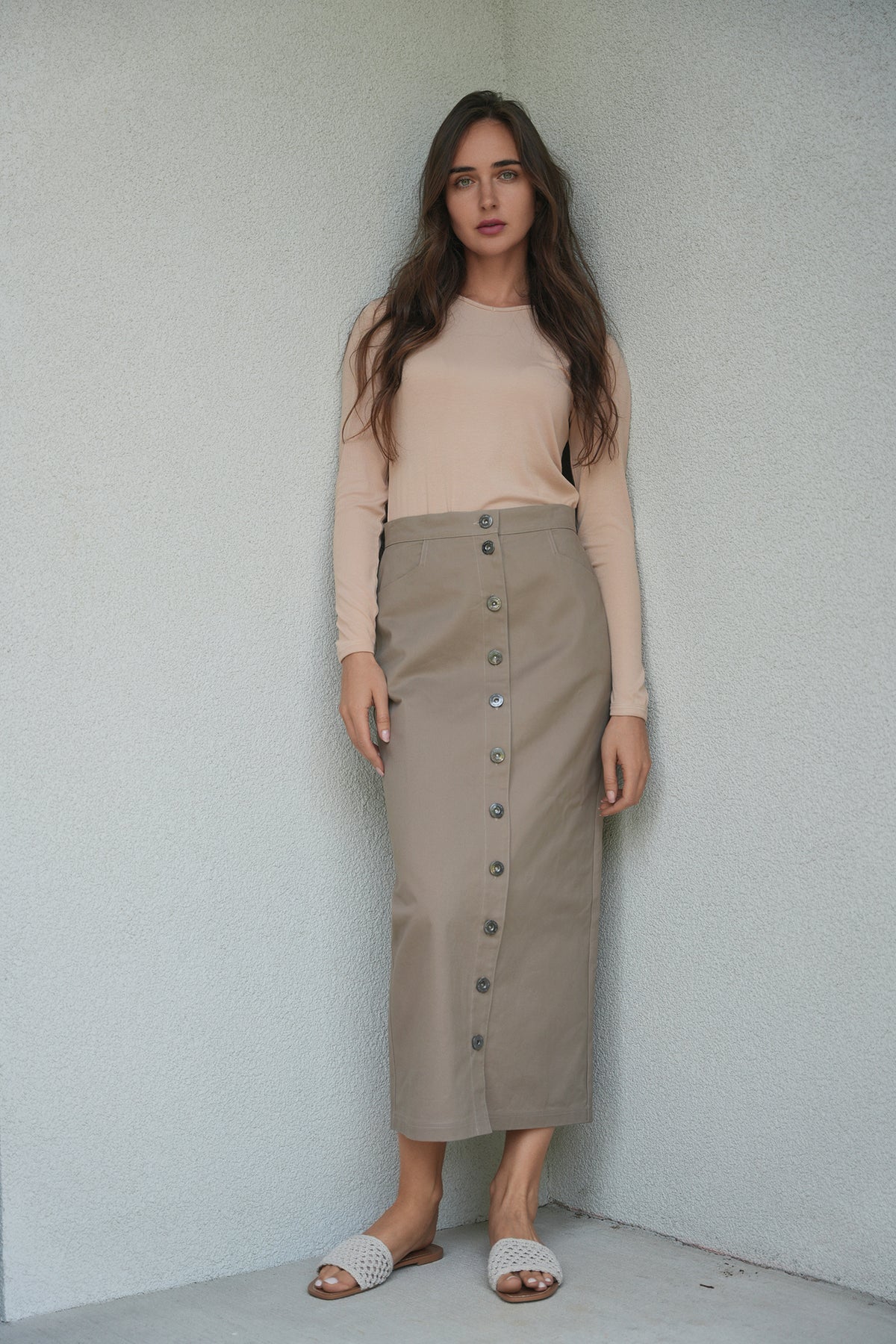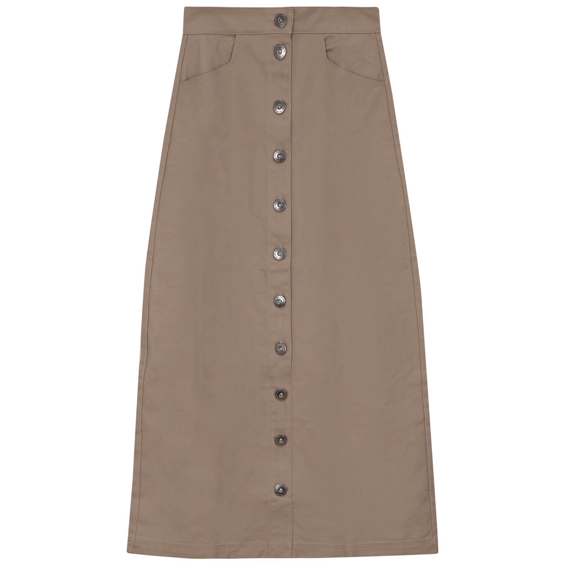 Ladies cotton maxi button down skirt with welt pockets at front.ֲ