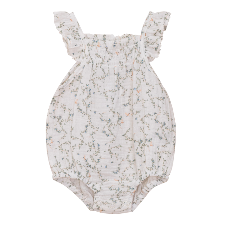 Baby girls crinkle woven allover leaves and bird print romper with covered elastic waistband at front and back with rufflle at arm opening. ֲ