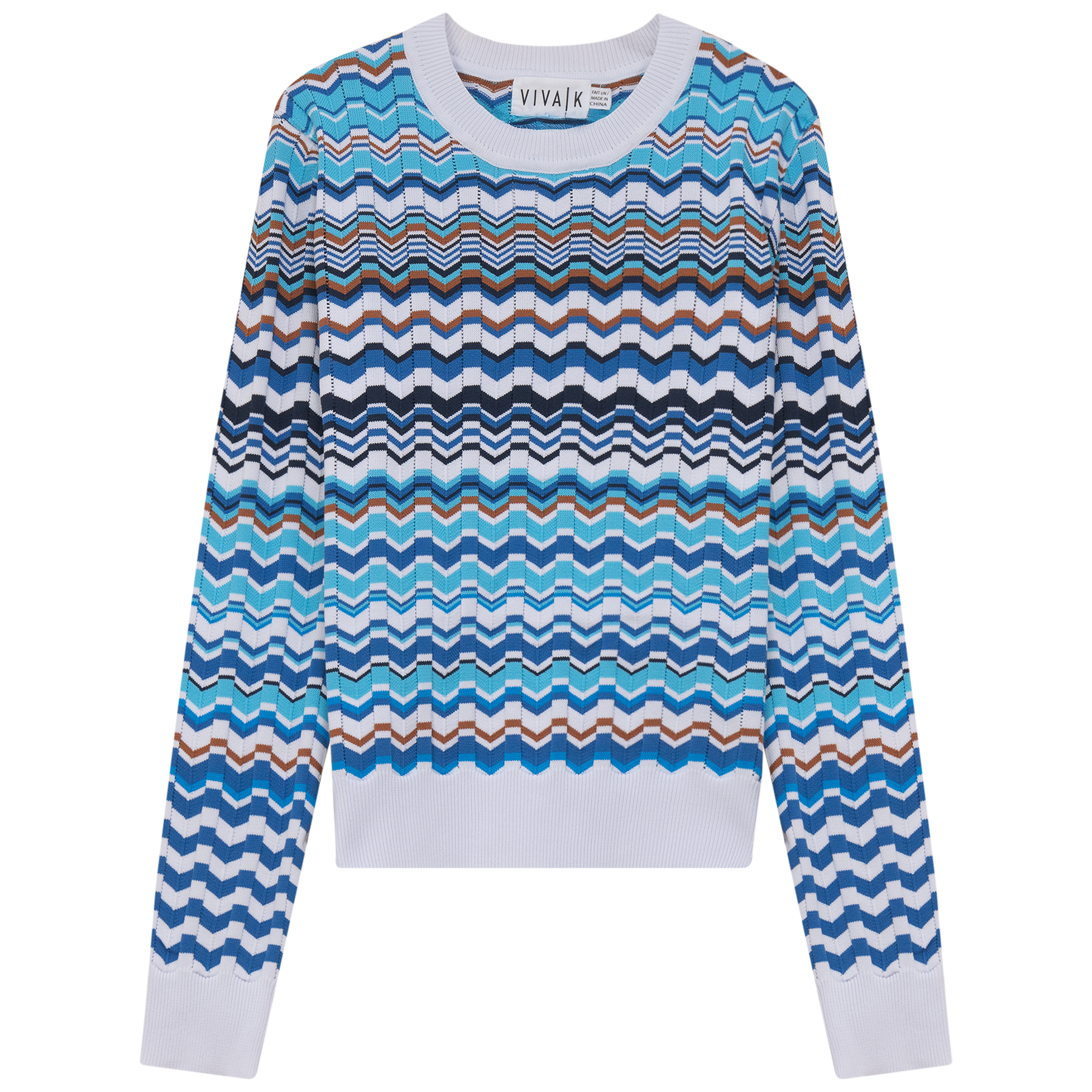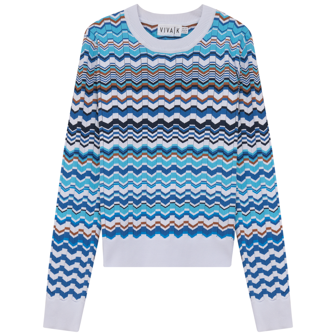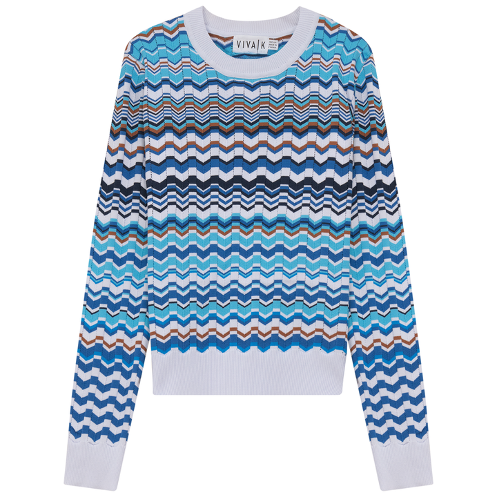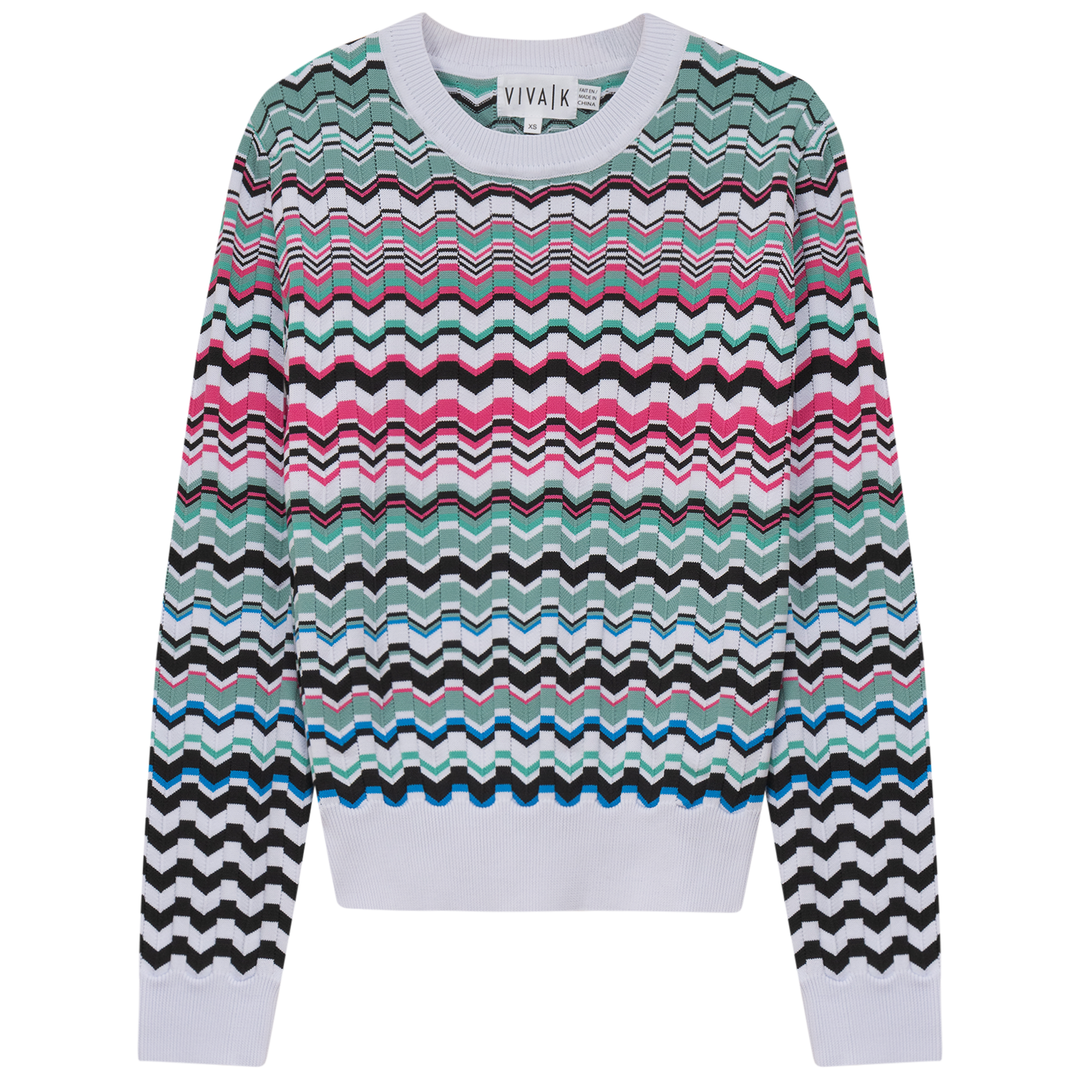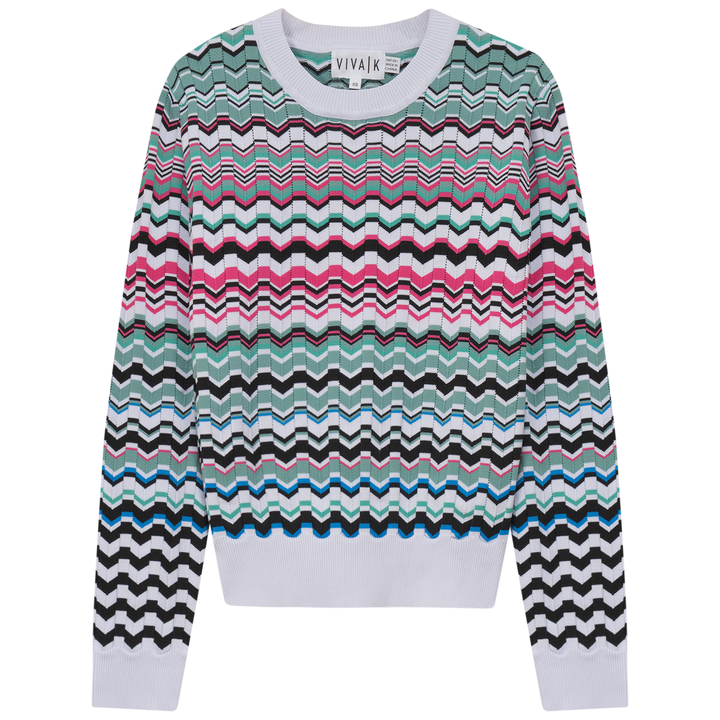 Ladies crochet multicolor chevron knit top with solid ribbed hemband and cuffs. ֲ