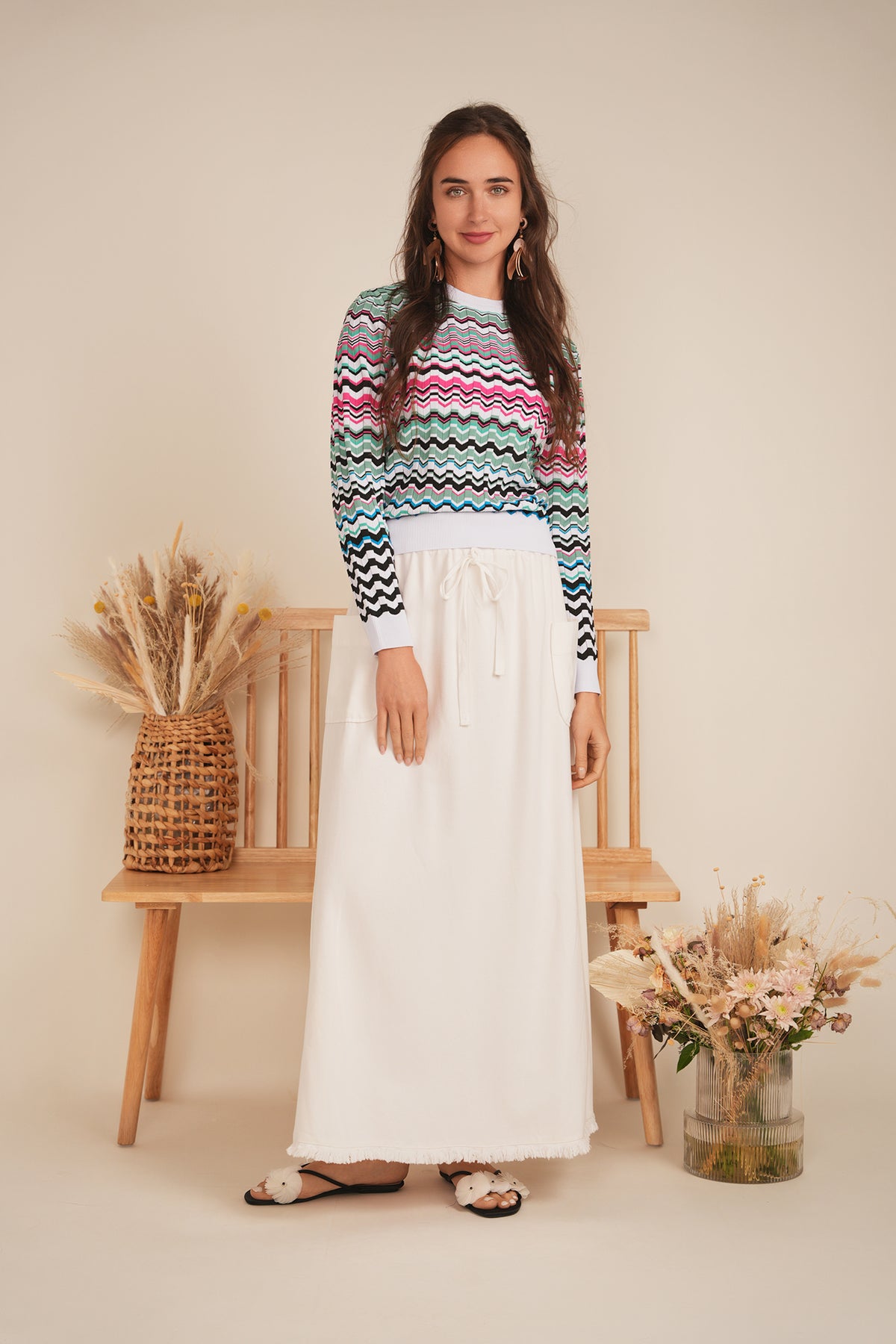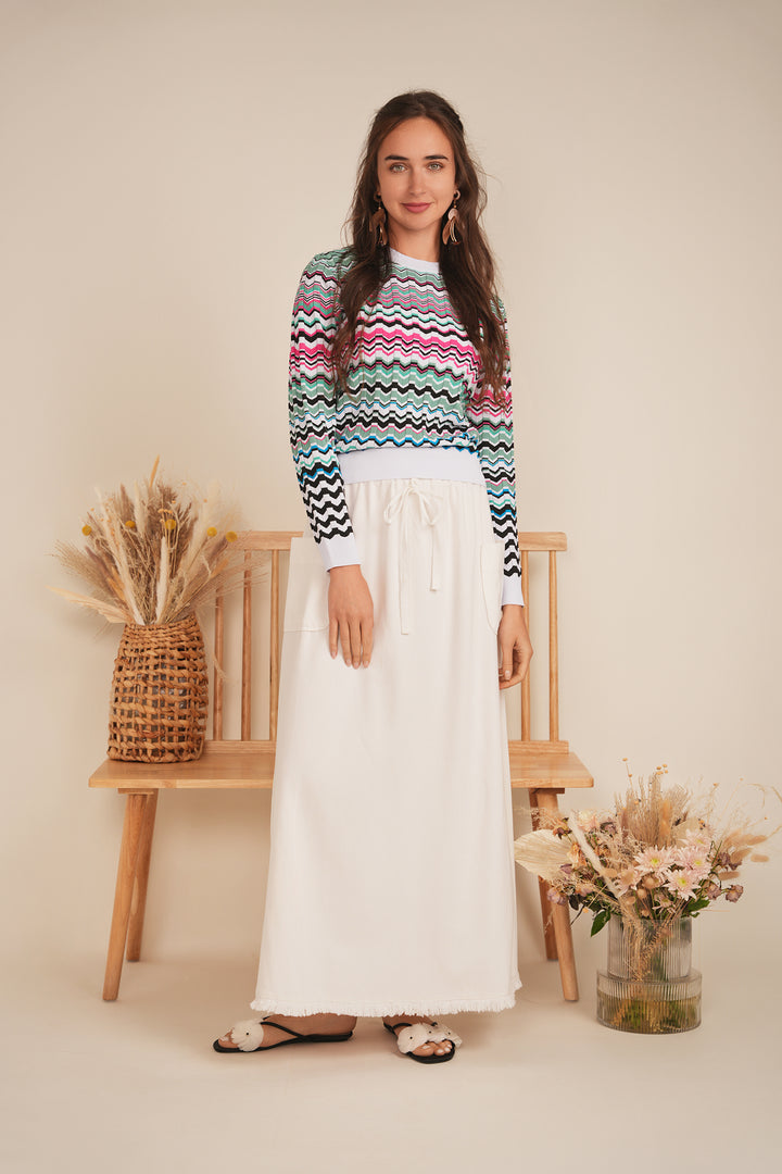 Ladies crochet multicolor chevron knit top with solid ribbed hemband and cuffs. ֲAvailable in the following colors: