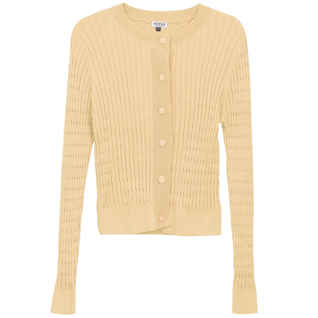 Ladies cropped cable knit cardigan with center front marble button opening. ֲ