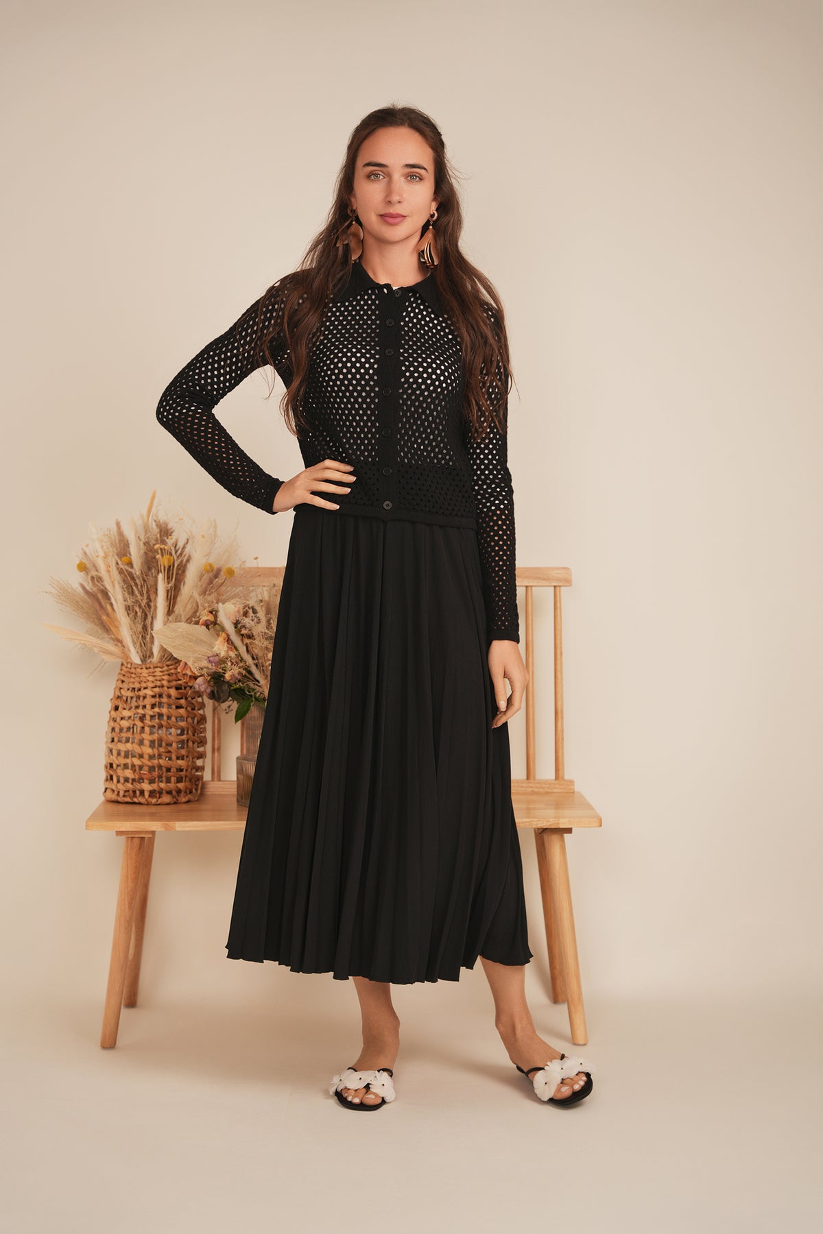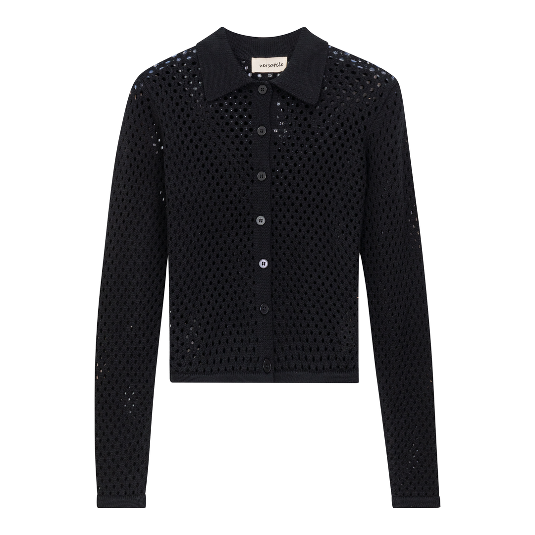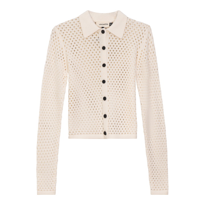 Ladies cropped crochet knit sweater with collar and center front button opening.ֲAvailable in the following colors: