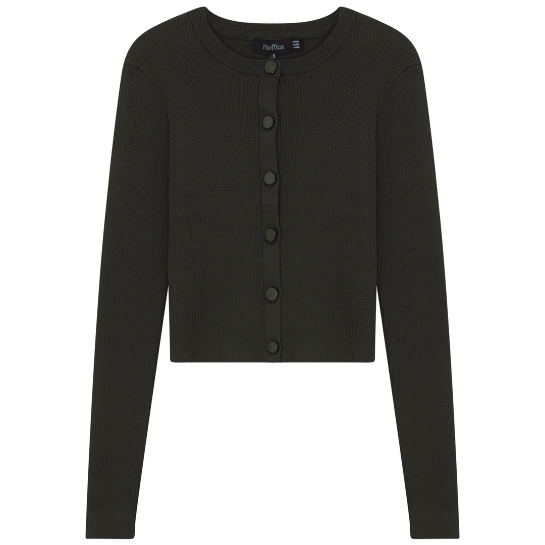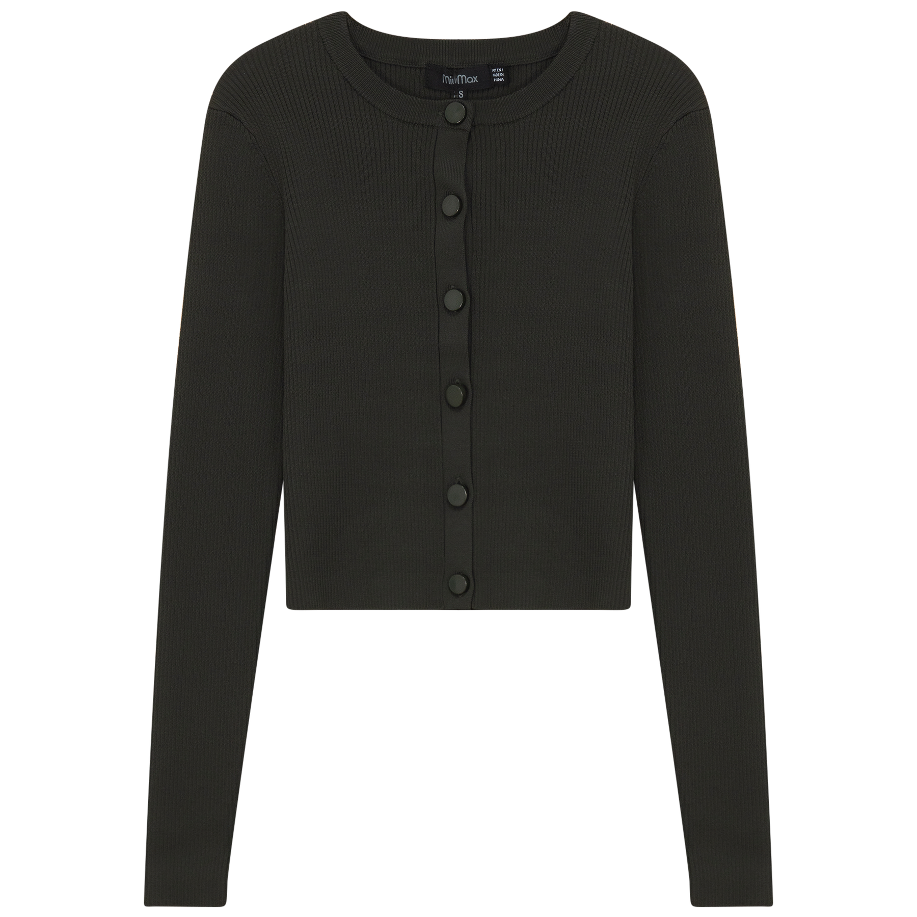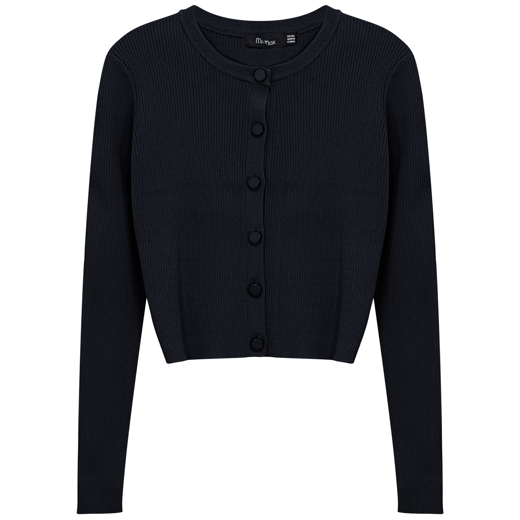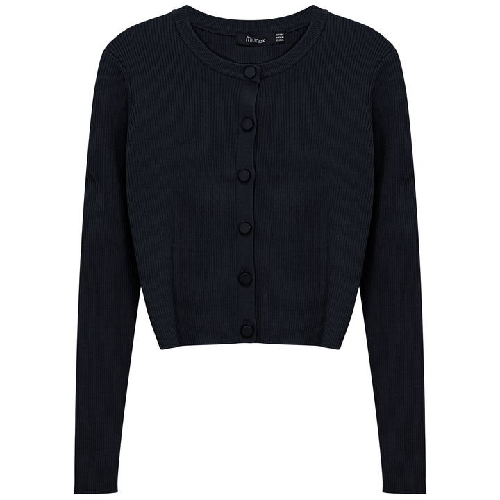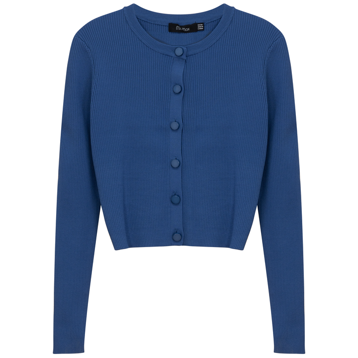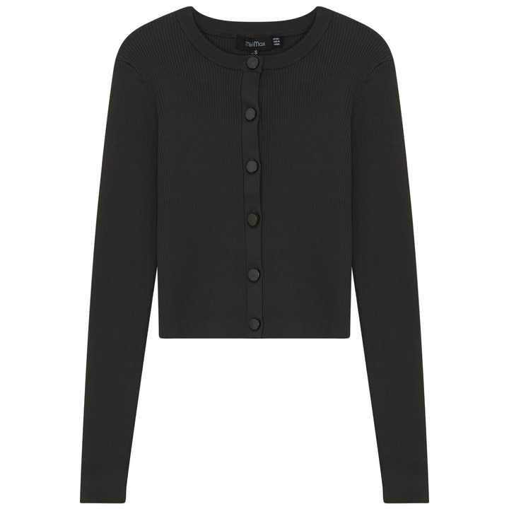 Ladies cropped fit ribbed knit cardigan with center front button opening. ֲ