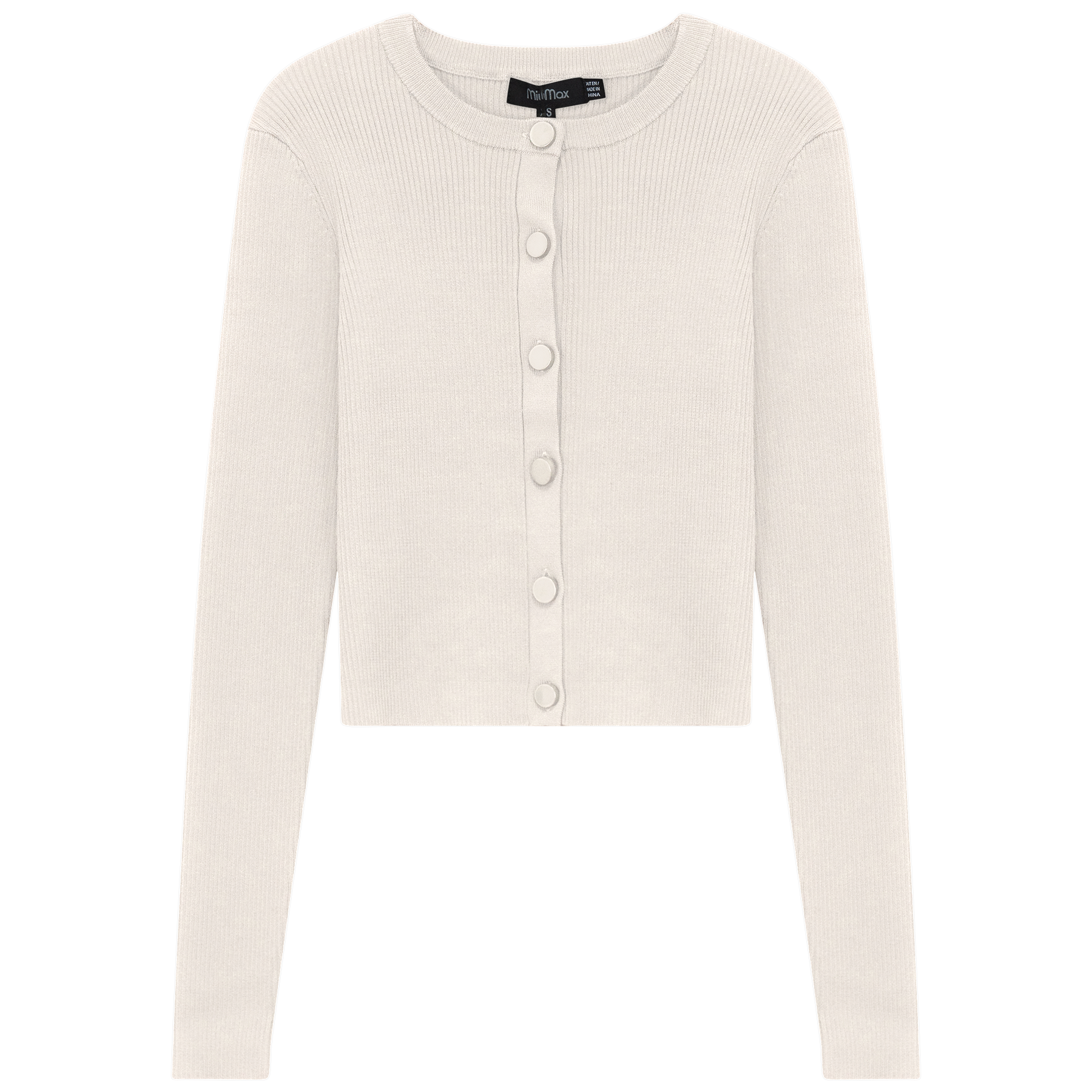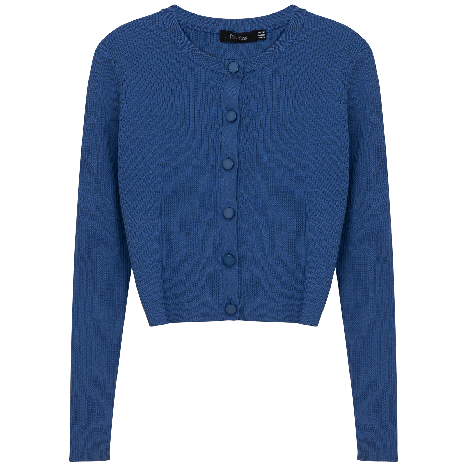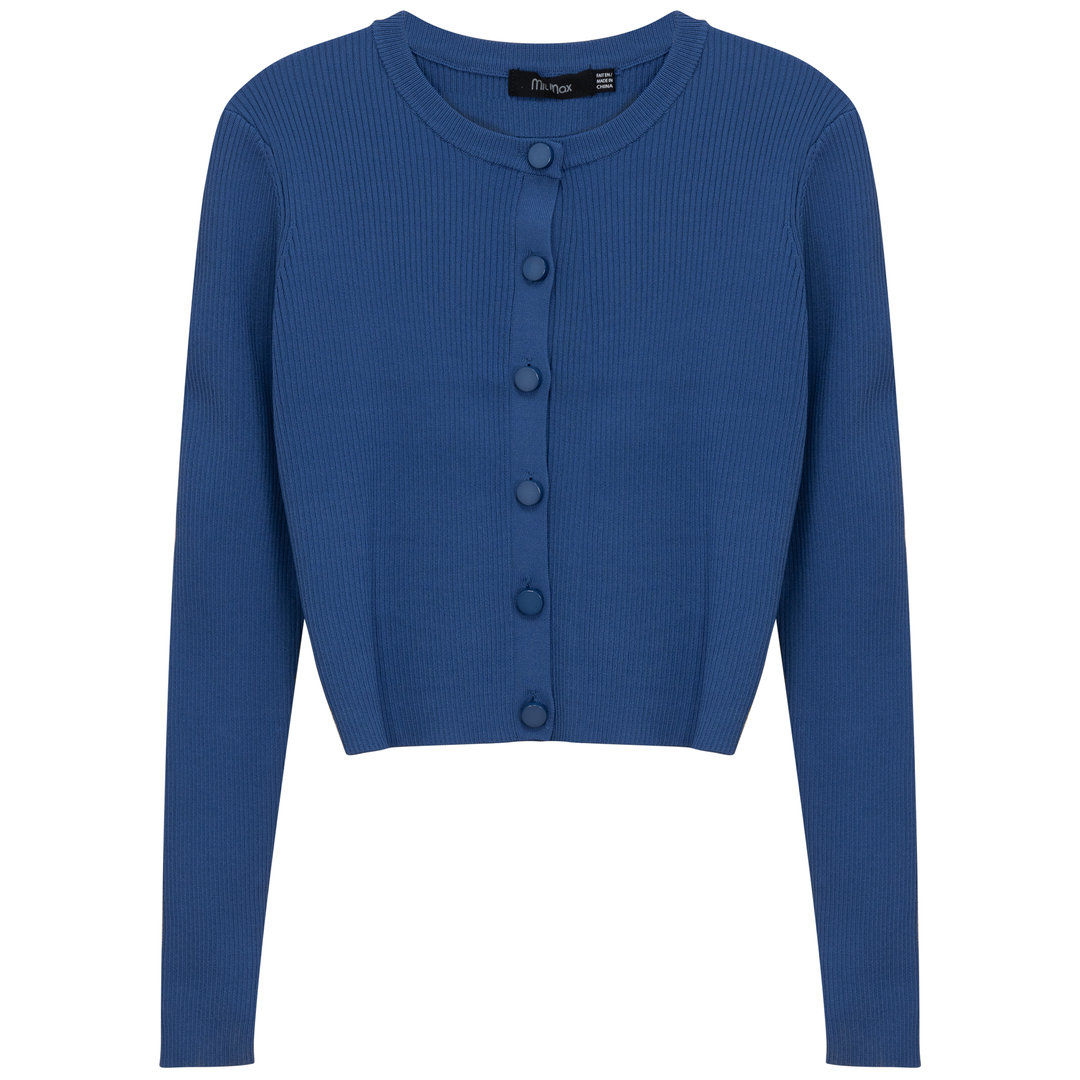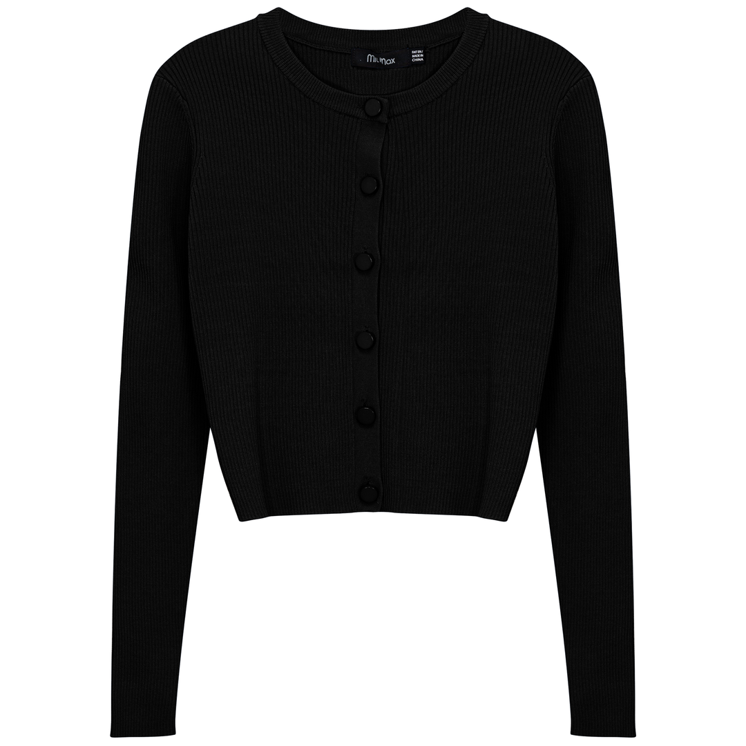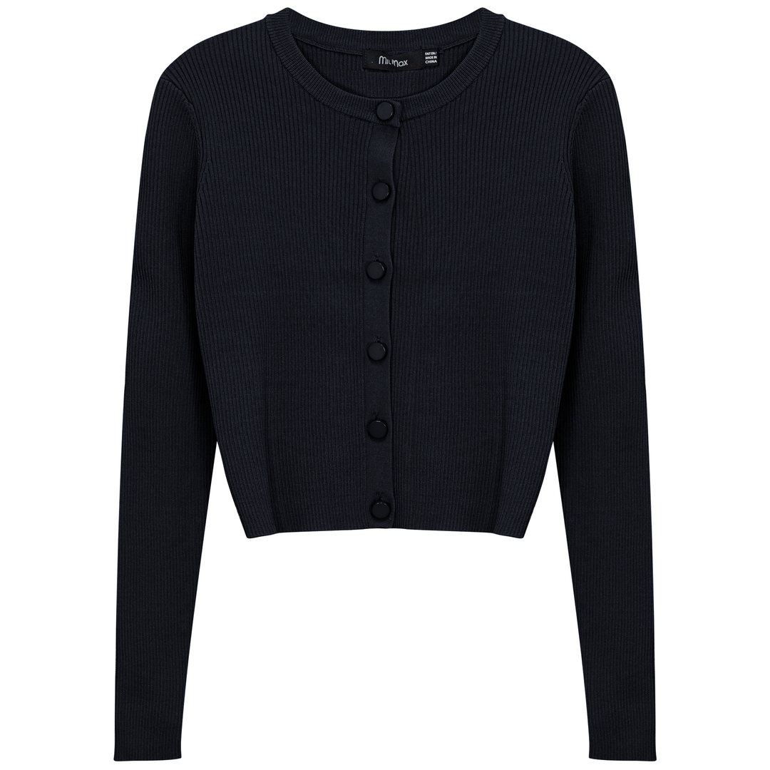 Ladies cropped fit ribbed knit cardigan with center front button opening. ֲ