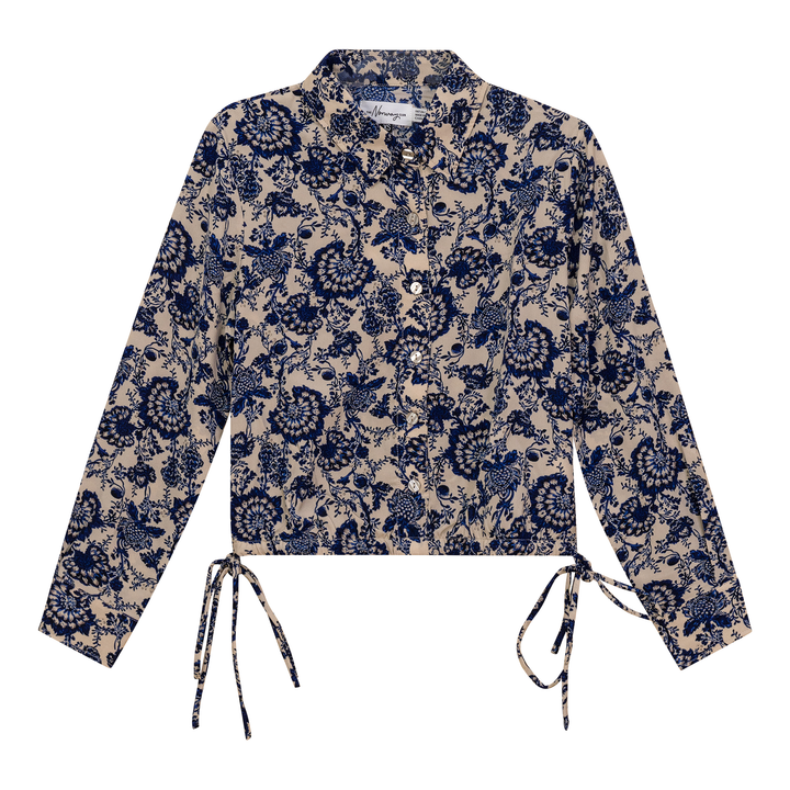 Ladies long sleeve cropped printed chiffon blouse with invisible center front button opening and self spaghetti drawstrings . ֲ