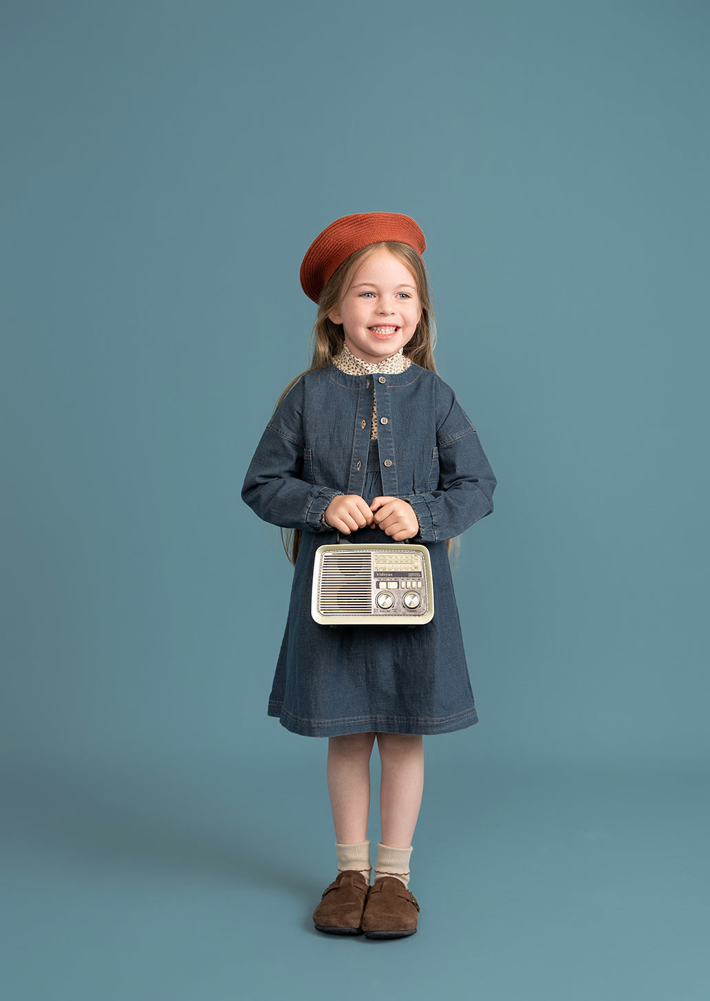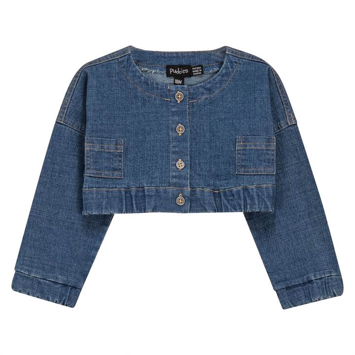 Girls long sleeve denim jacket with center front button opening, elastic at cuffs and hemband with patch pockets at front. ֲ