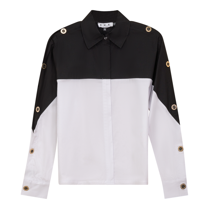 Ladies long sleeve dolman 2 tone button down shirt with buttons along sleeves. ֲ