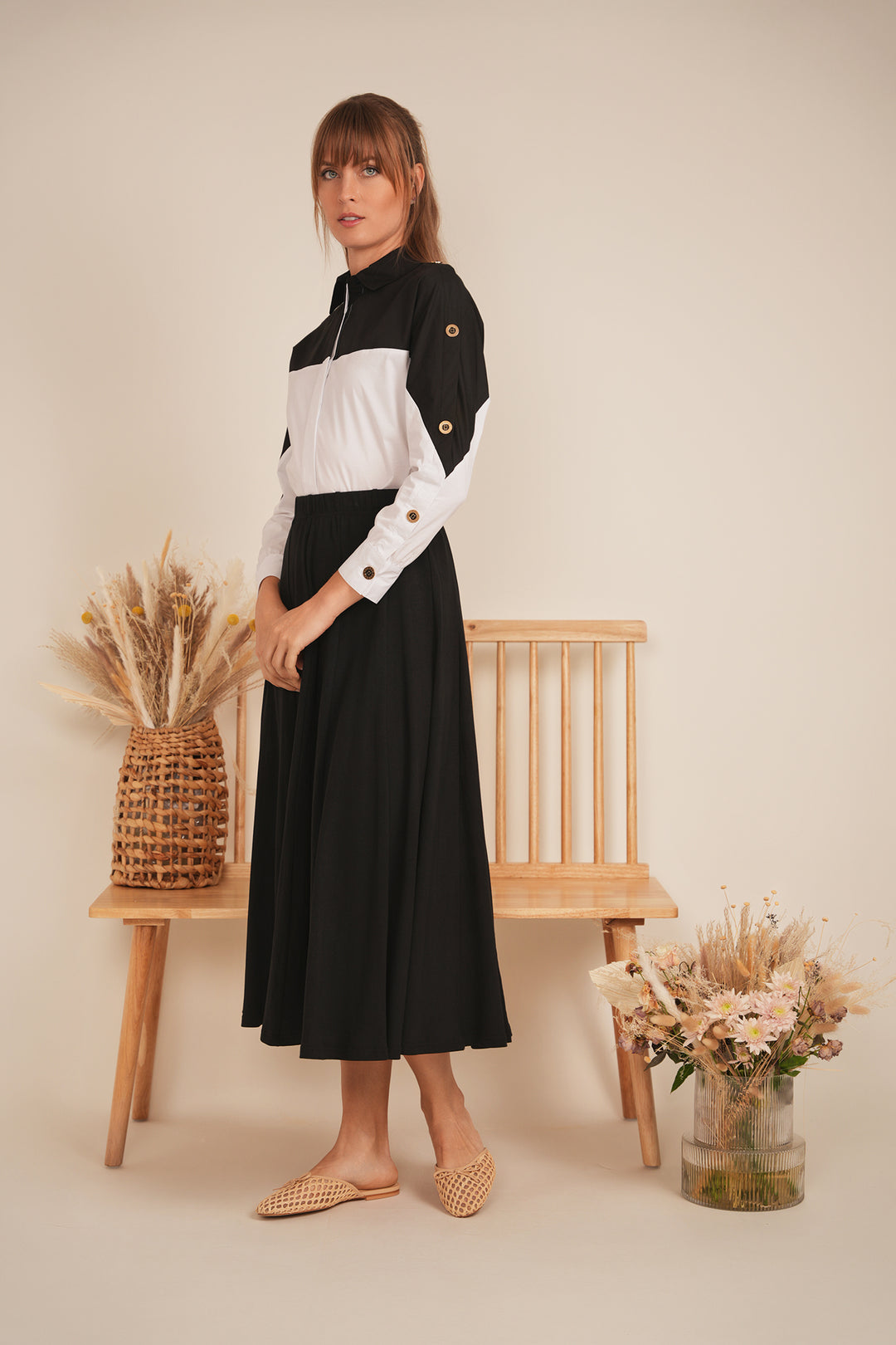 Ladies long sleeve dolman 2 tone button down shirt with buttons along sleeves. ֲAvailable in the following colors: