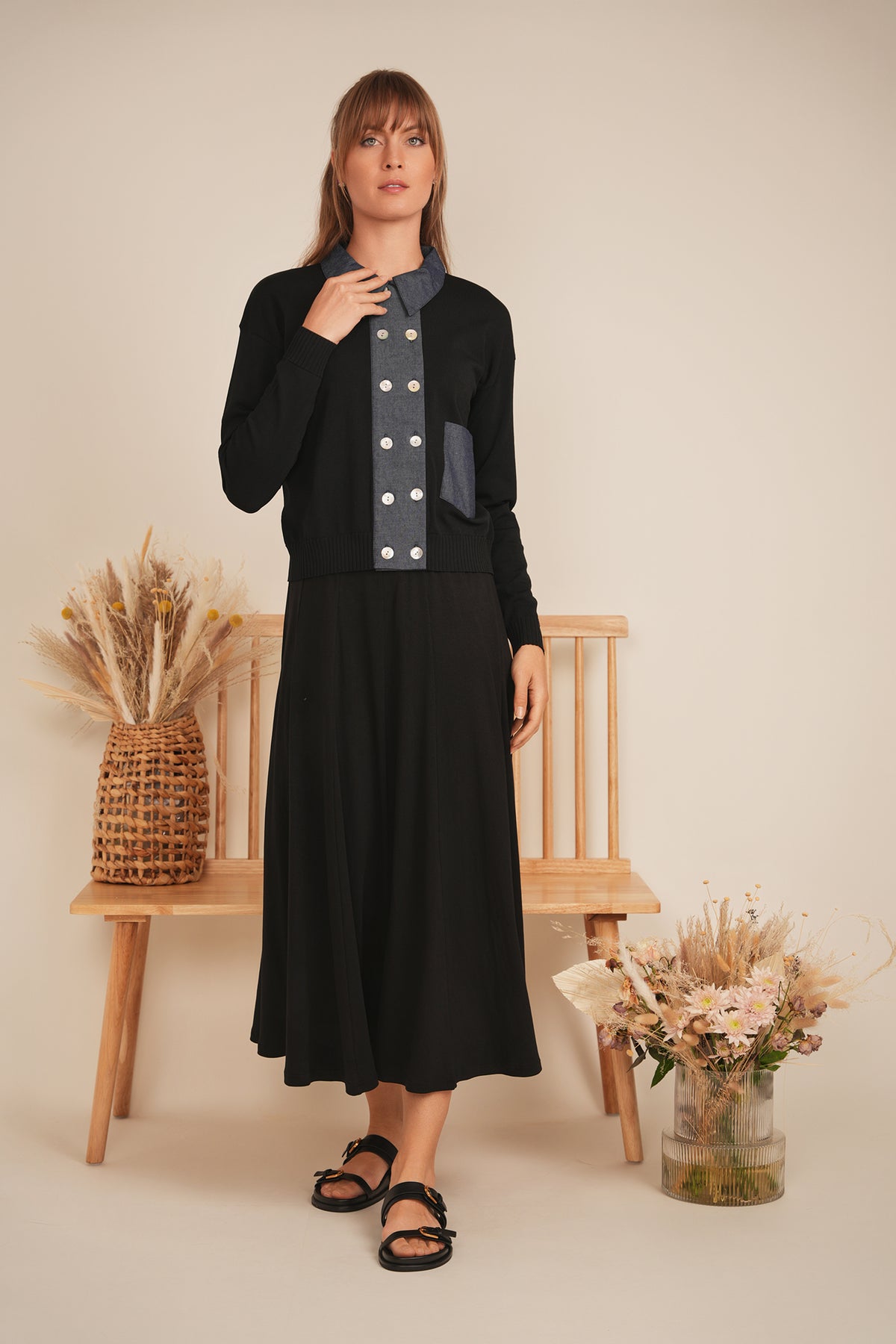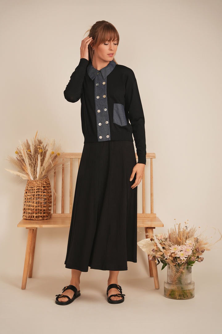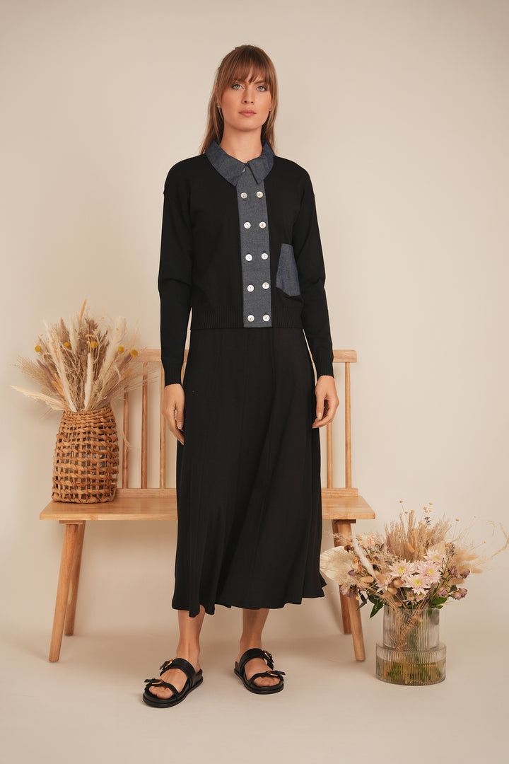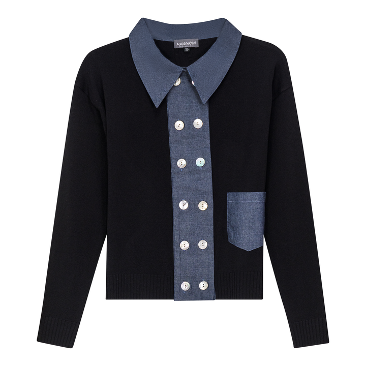 Ladies long sleeve double breasted knit combo sweater with patch pocket at front and covered elastic waistband. ֲ