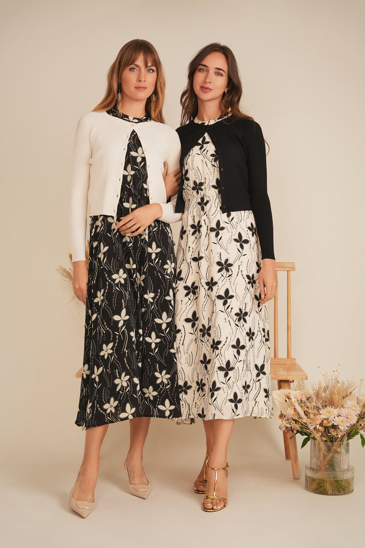 Ladies floral chiffon bungee jumper with elastic at waist with self spaghetti bow tie, and center back invisible zipper opening. ֲ