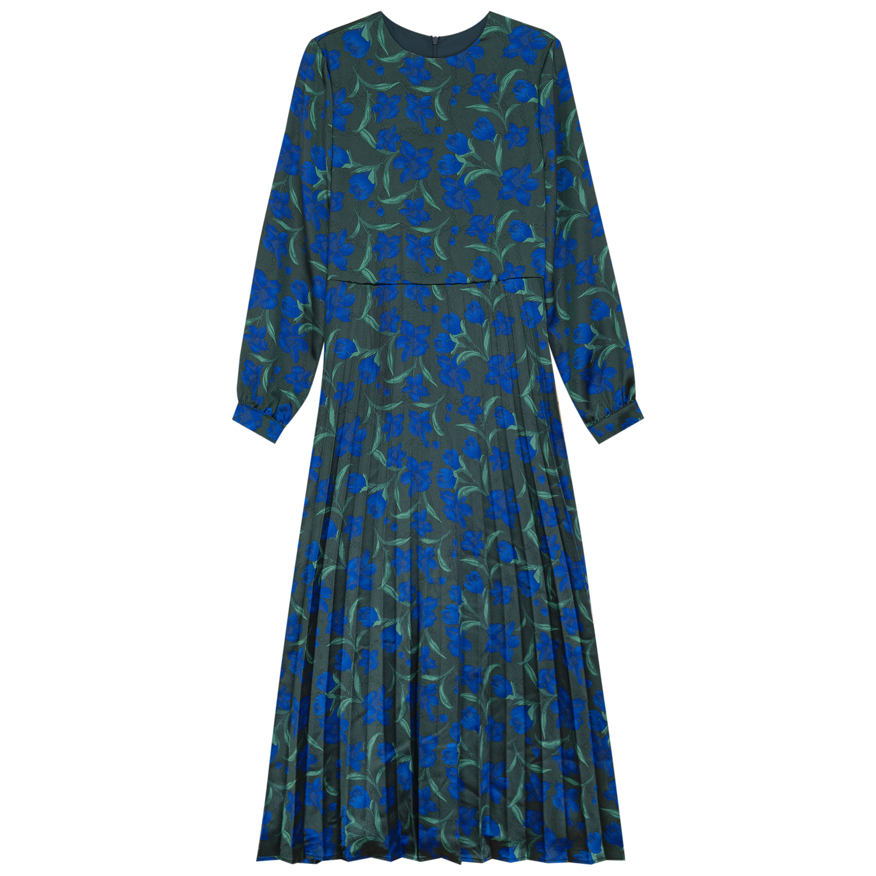 Ladies long sleeve allover floral woven dress with pleated bottom, center back invisible zipper with inside lining. ֲ
