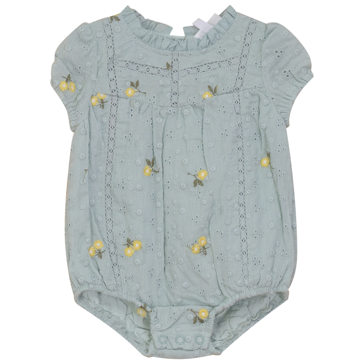 Baby girls woven cotton flower embroidered bubble with ruffle neckline, center back button opening and snaps at bottom. ֲ