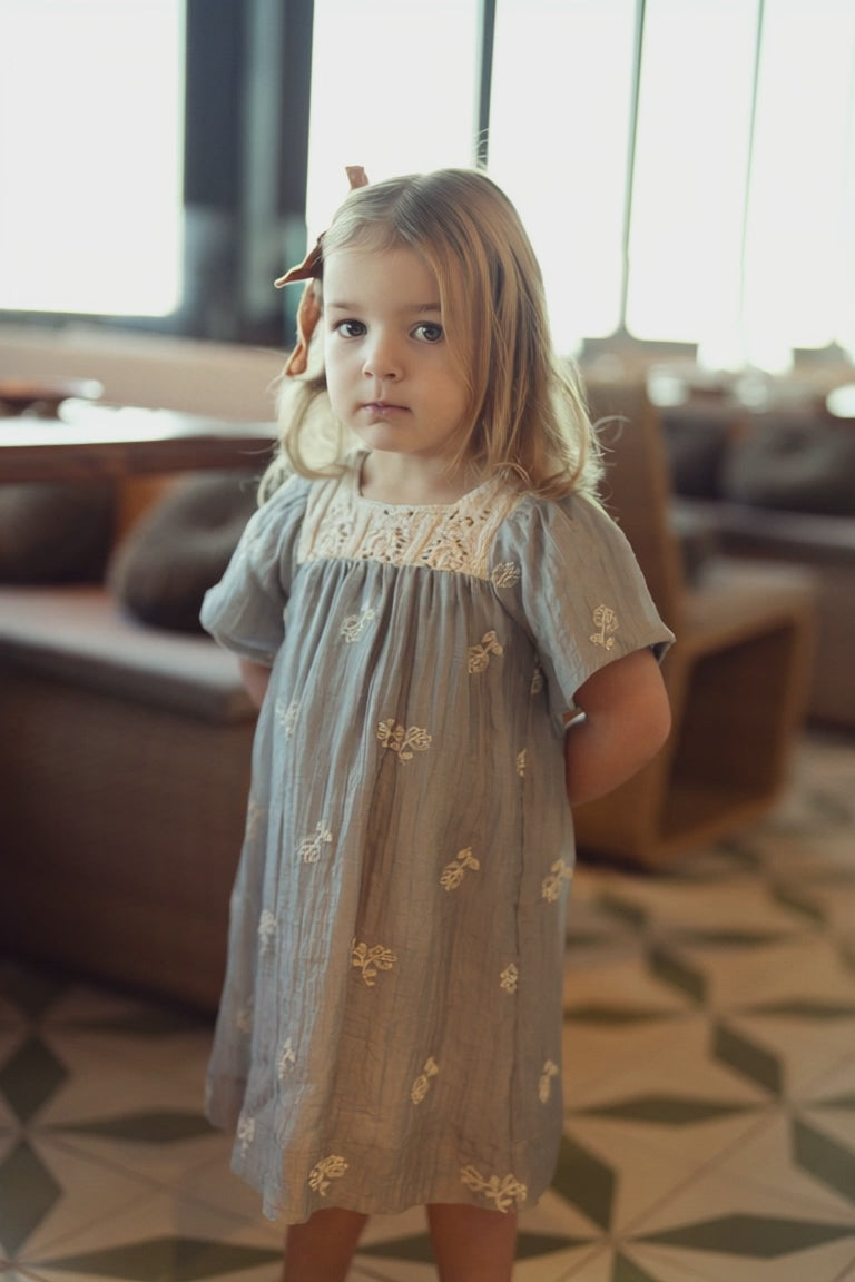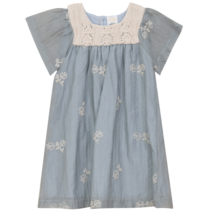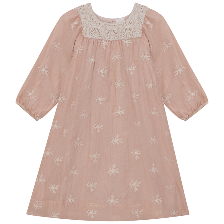 Girls flower embroidered dress with crochet yoke and center back button opening.3/4 sleeves from size 5 and up.ֲ