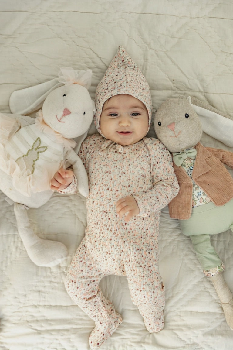 Baby boys and baby girls soft rib allover flower leaves print onesie with overlap shoulders and snap opening at back with matching bonnet.ֲ