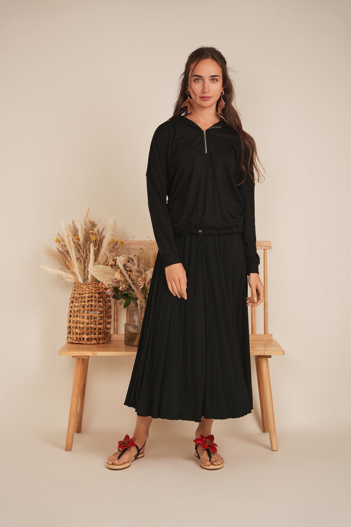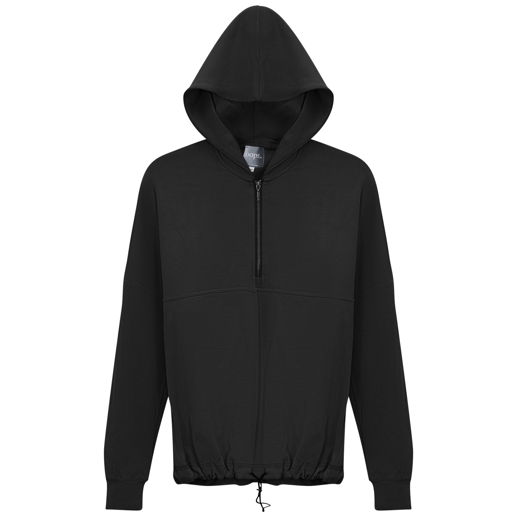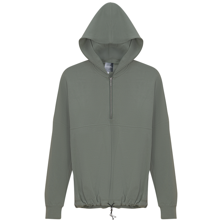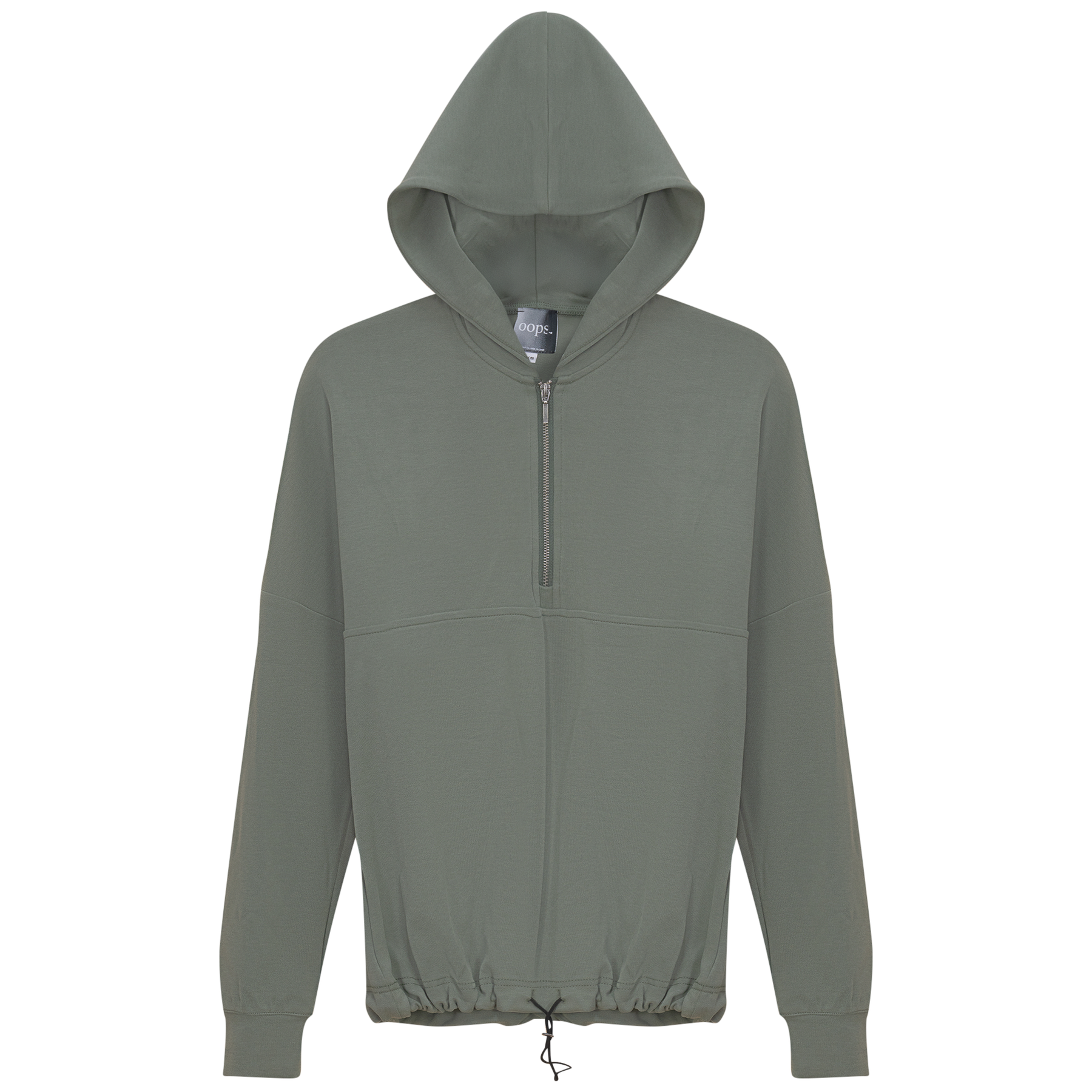 Ladies long sleeve hooded sweatshirt with bungee cord at hemband and center front zipper opening. ֲ