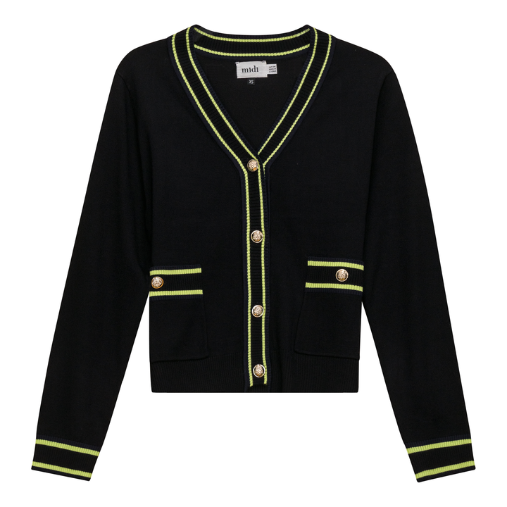 Ladies long sleeve knit cardigan with contrast stripes, center front shank button opening and pockets at front. ֲAvai...