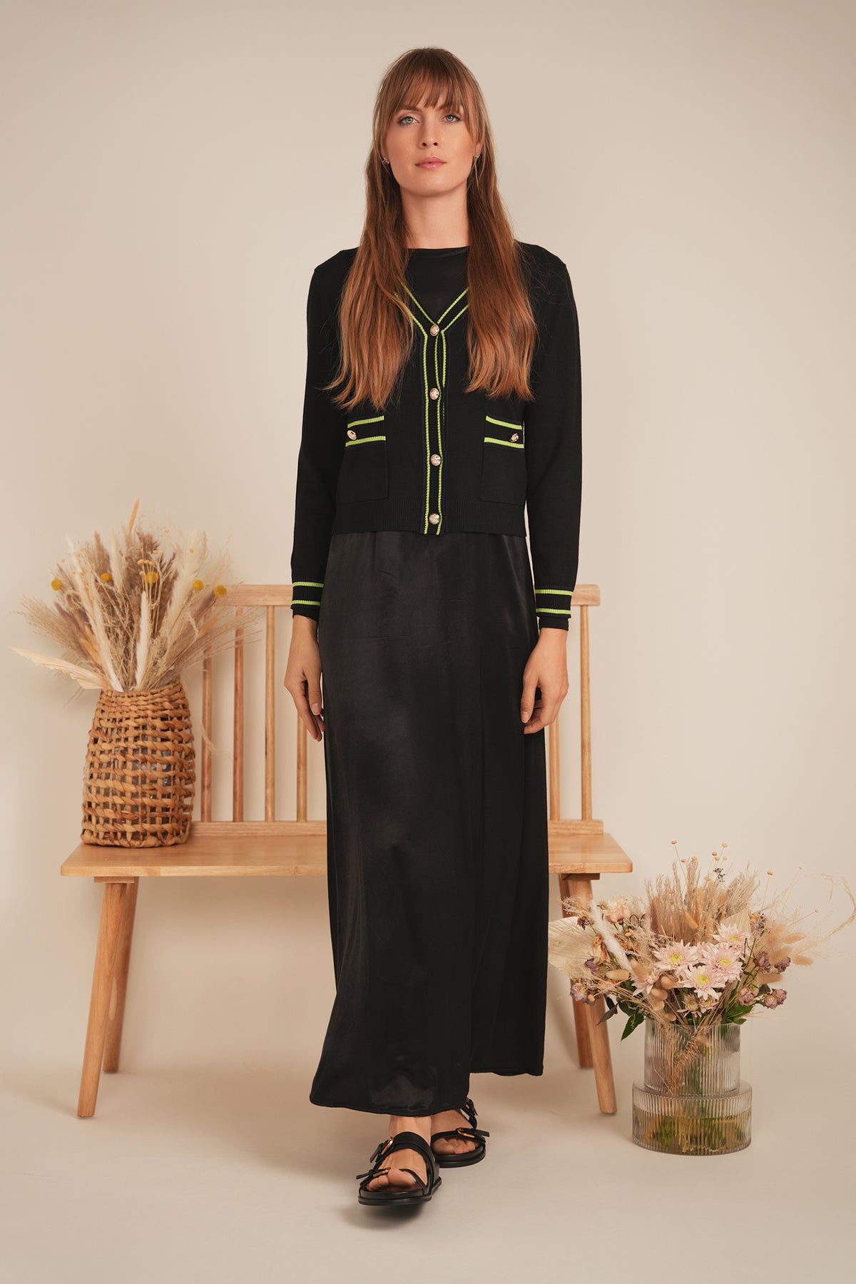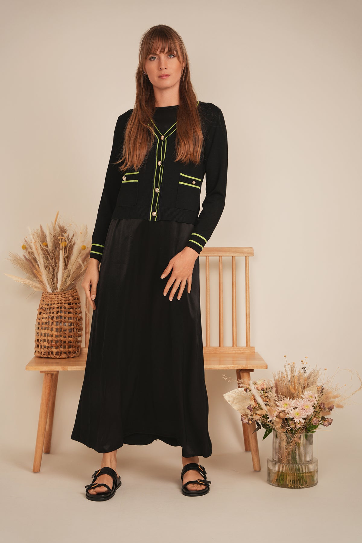 Ladies long sleeve knit cardigan with contrast stripes, center front shank button opening and pockets at front. ֲ