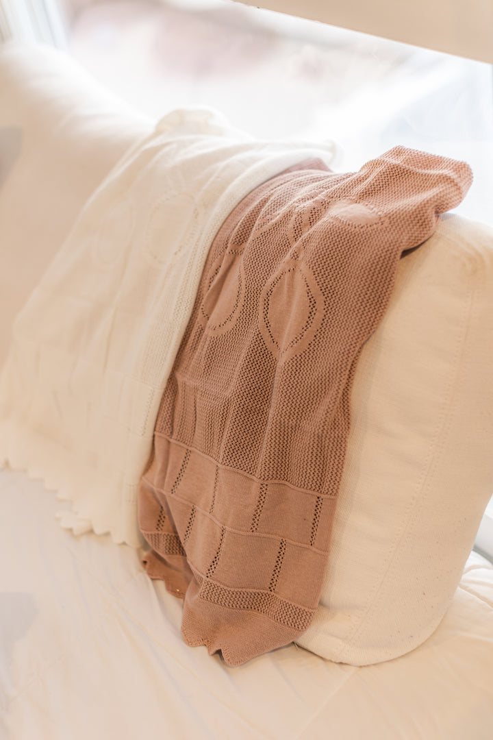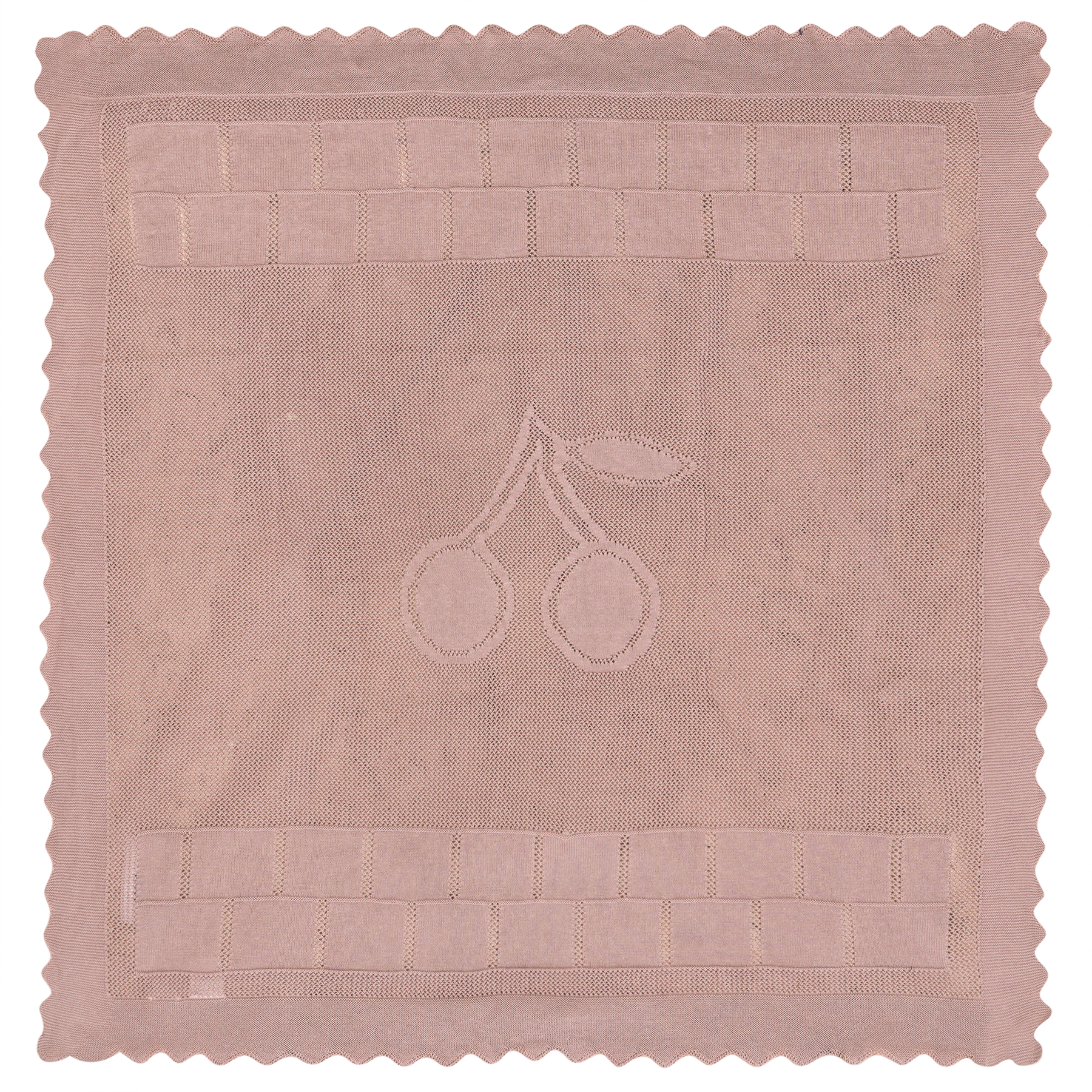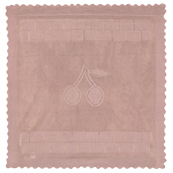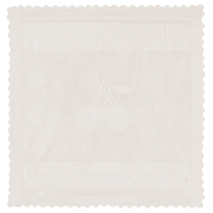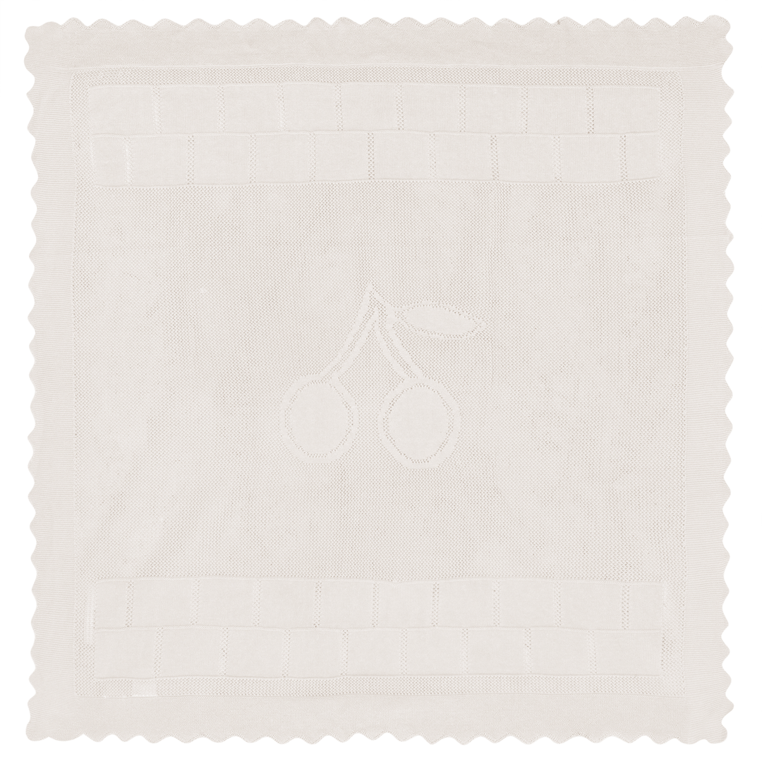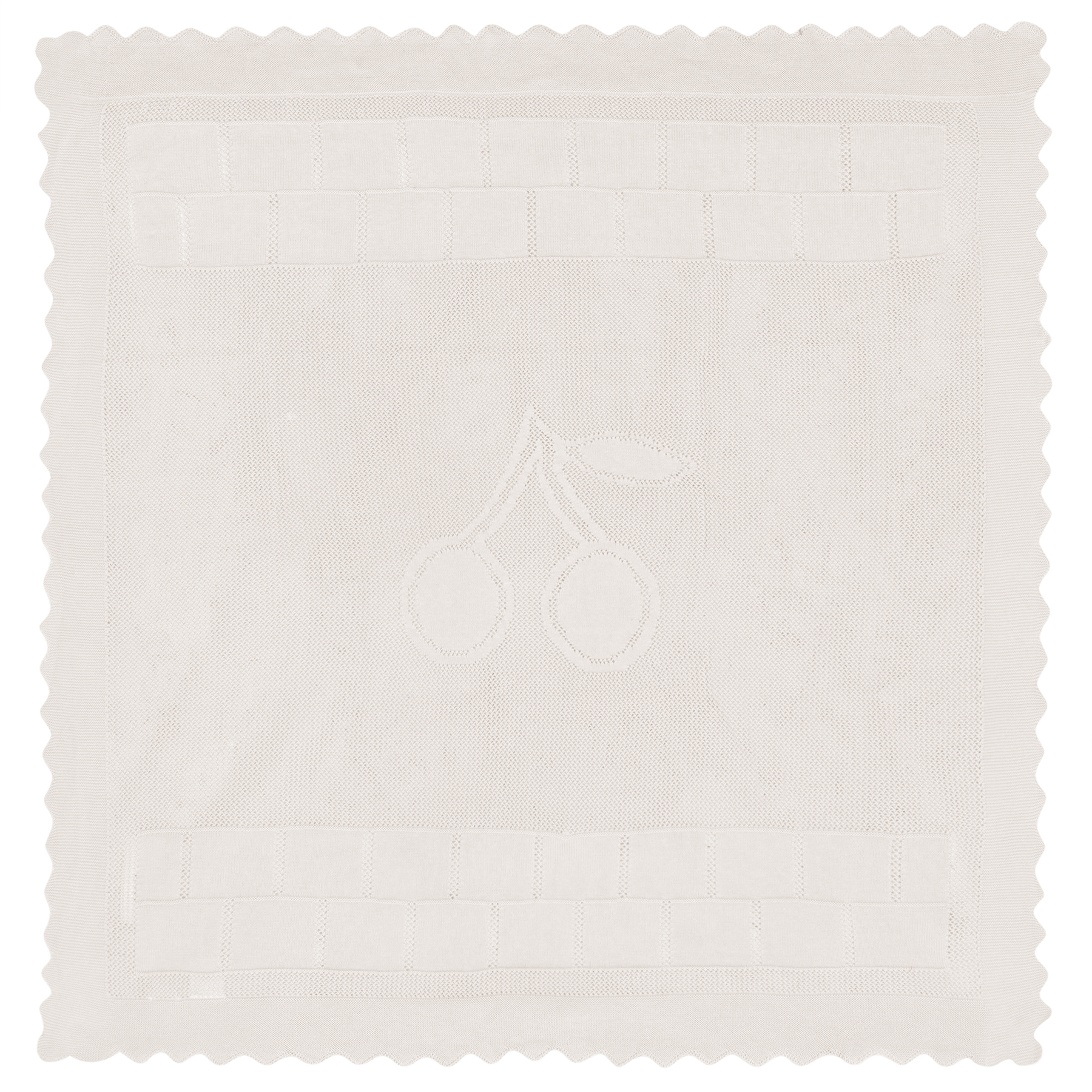 Baby boys and baby girls lace knit blanket with cherry print and scallop edge.ֲ