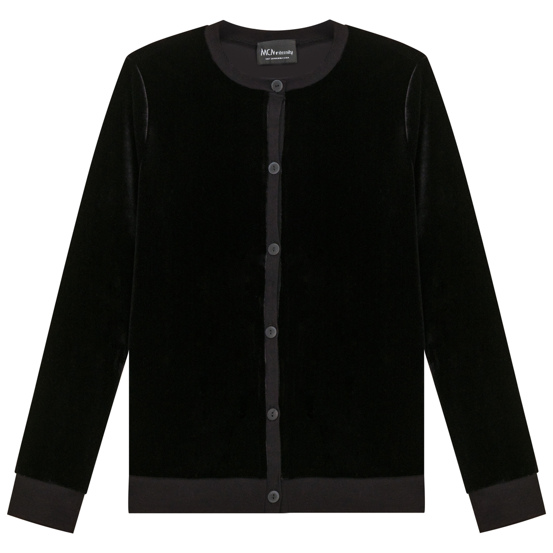 Ladies maternity slinky velour crop cardigan with center front button opening, ribbed cuffs and hemband. ֲ