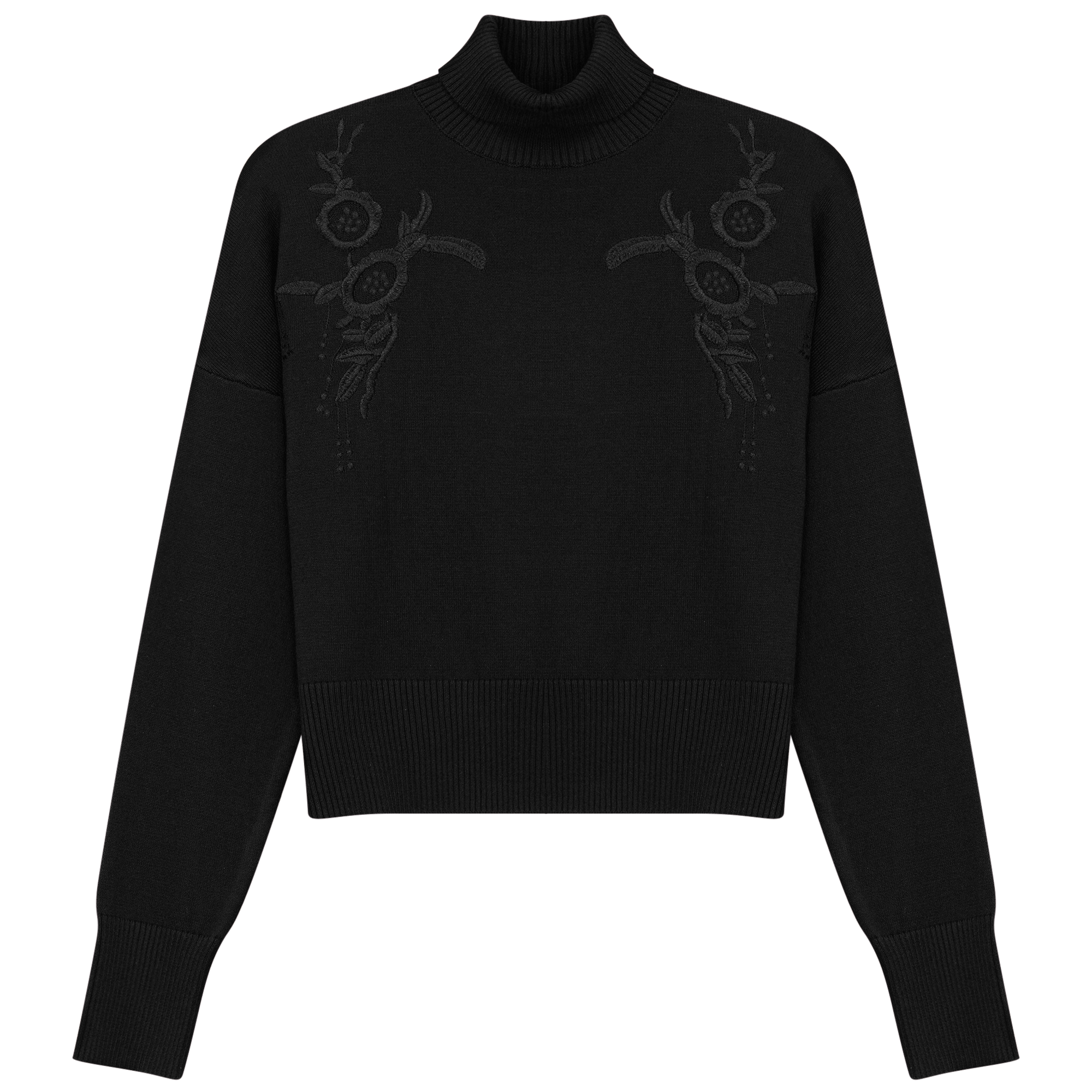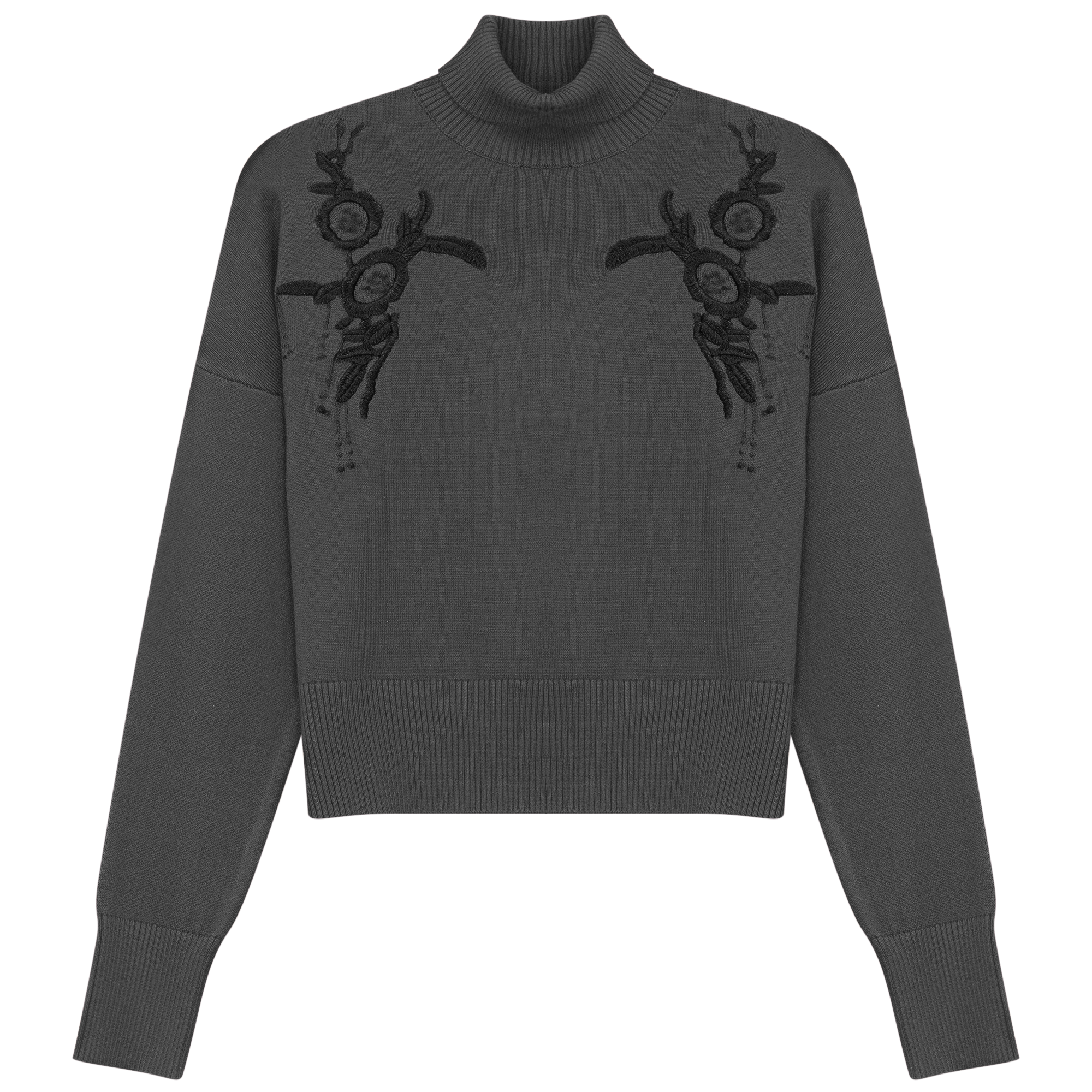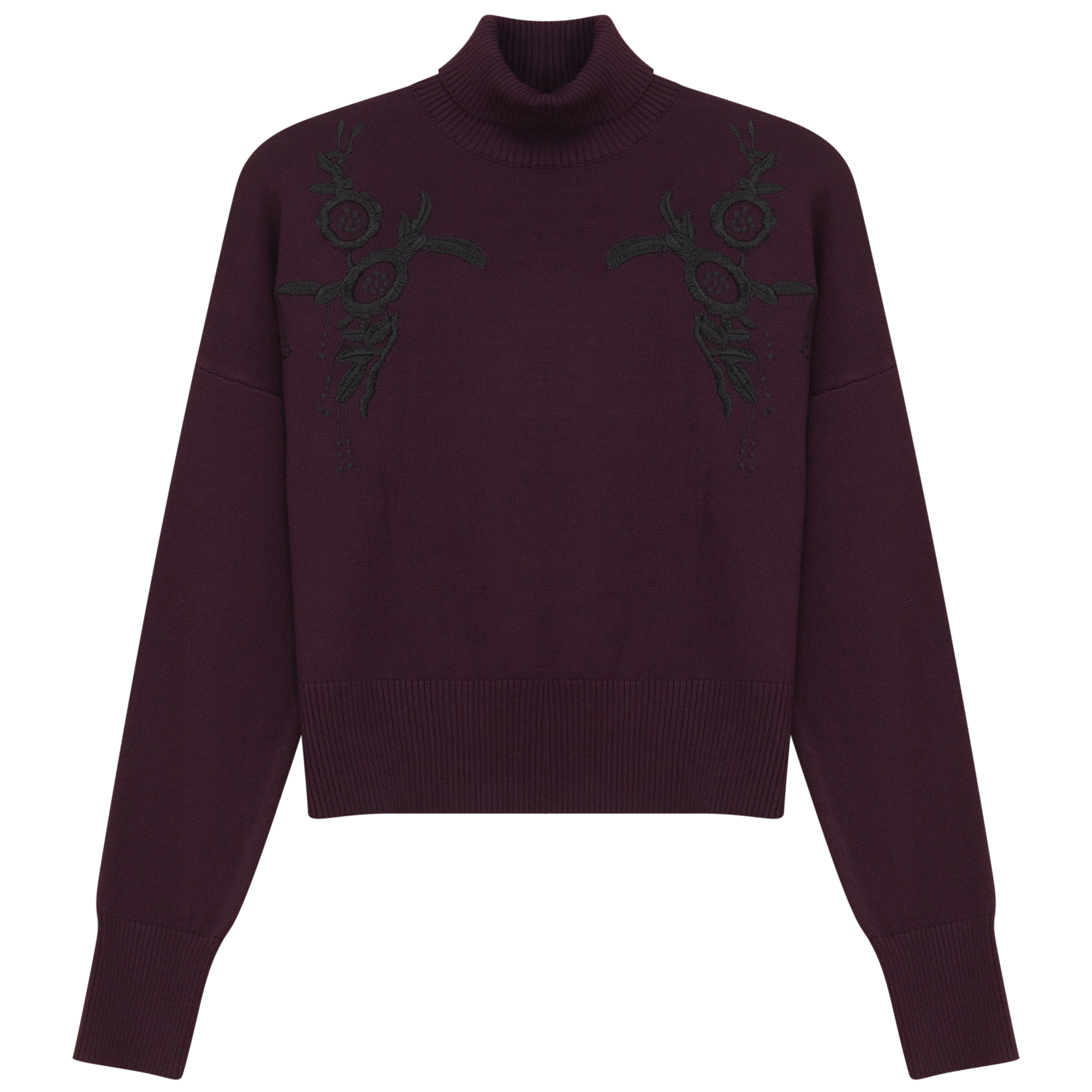 Ladies mock neck knit sweater with front chest applique. ֲ