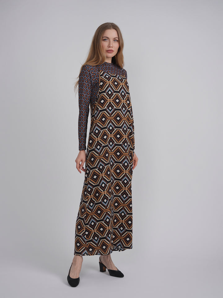 Ladies printed chiffon 2 piece set. Midi jumper with adjustable spaghetti straps. Matching long sleeve mock neck top. ֲ