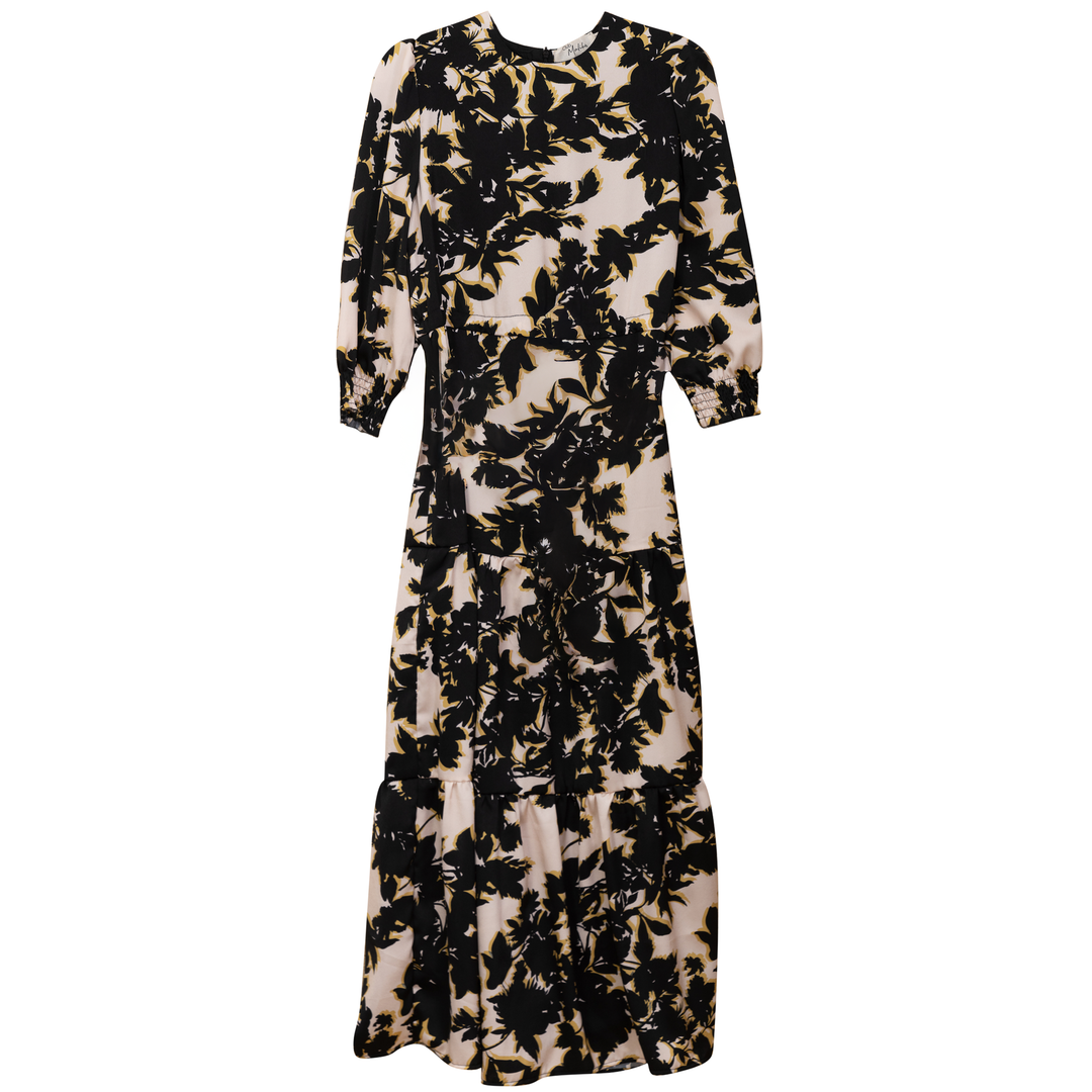 Ladies long sleeve printed chiffon high waisted midi dress with center back invisible zipper, self spaghetti drawstring at front and elastic at cuffs. ֲ