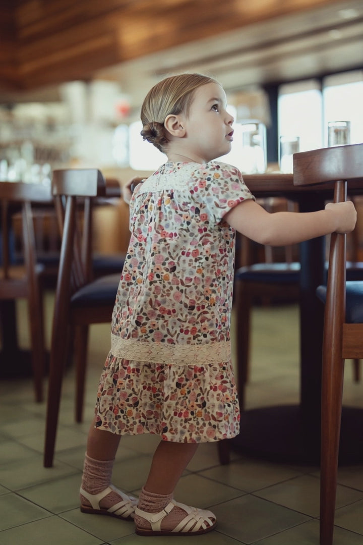 Girls cotton woven floral printed dress with lace around neck, elastic at cuffs and center back invisible zipper. ֲ