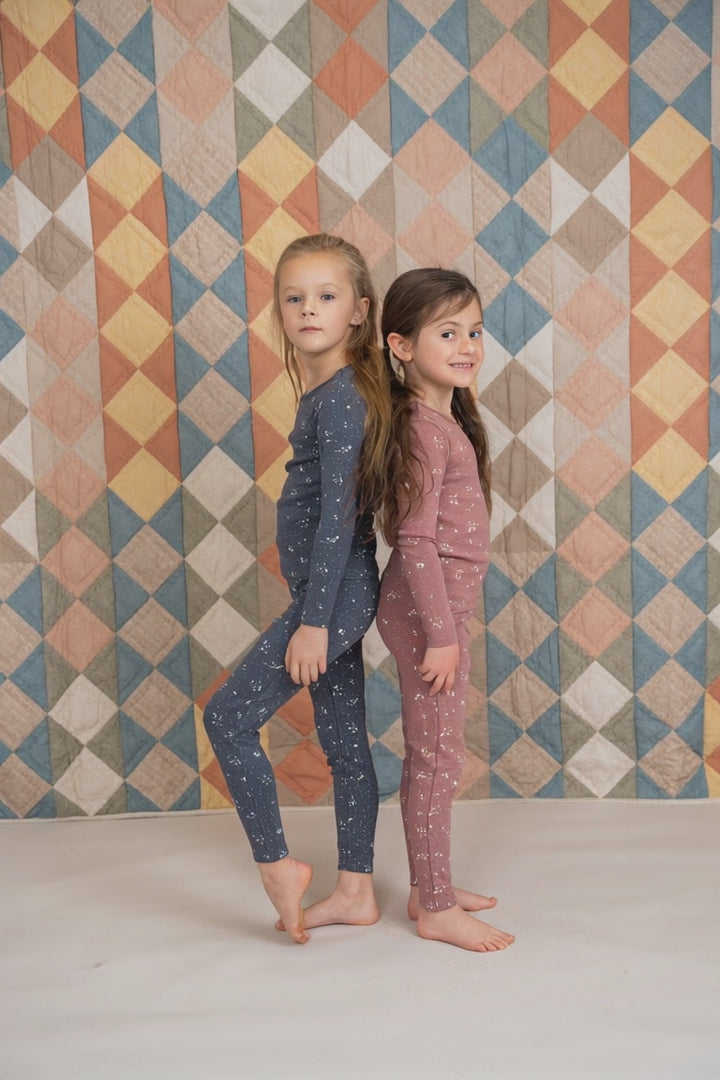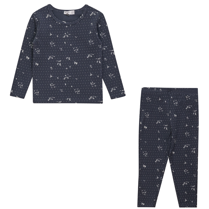 Boys and girls soft fine rib 2 piece set. Long sleeve printed top with round neck. Matching pants with covered elastic waistband. ֲ