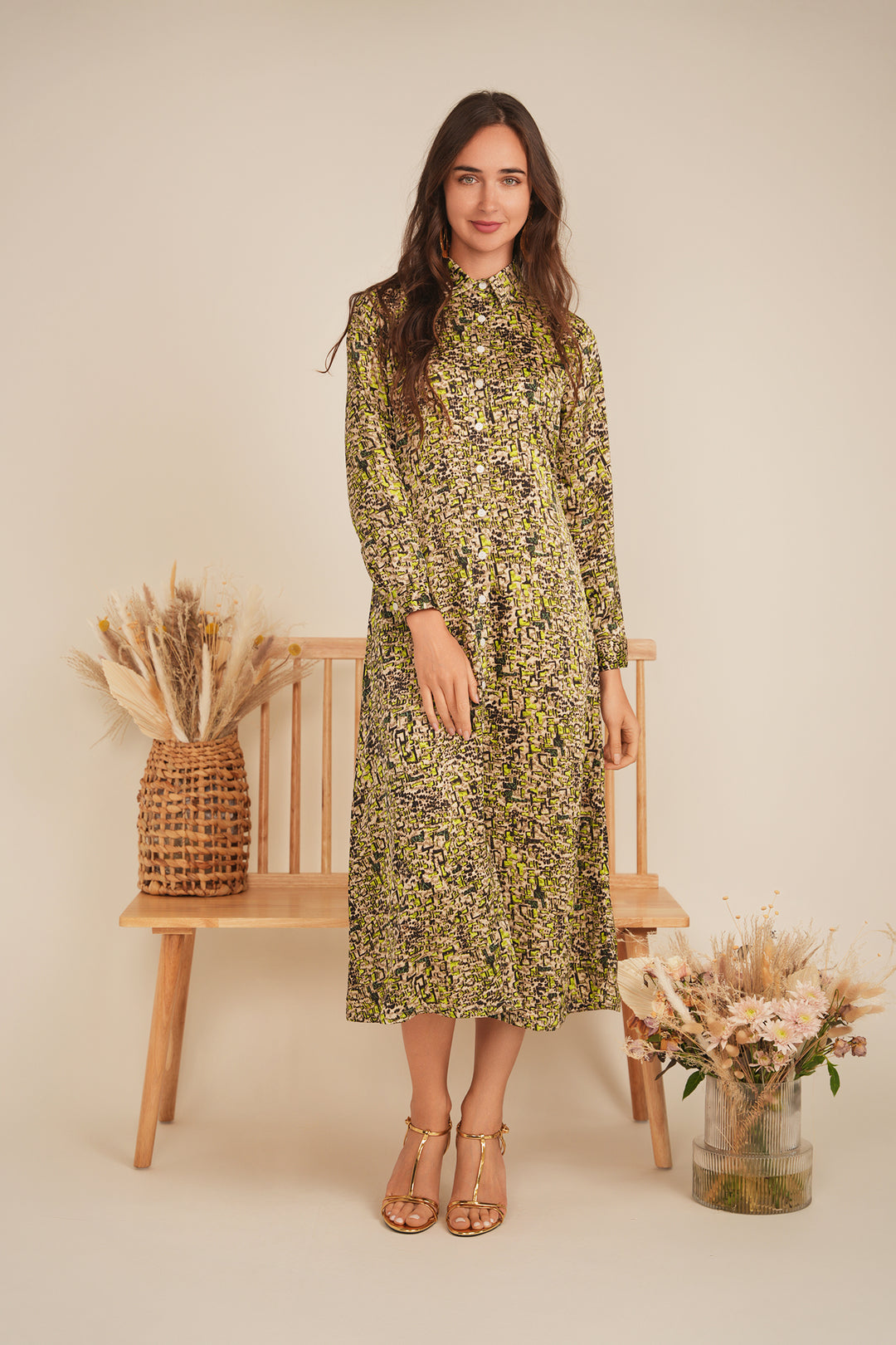 Printed Satin Midi Shirt Dress