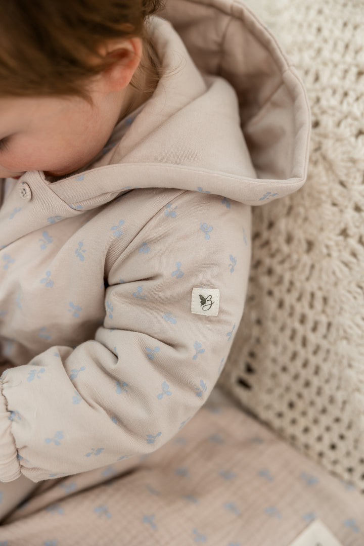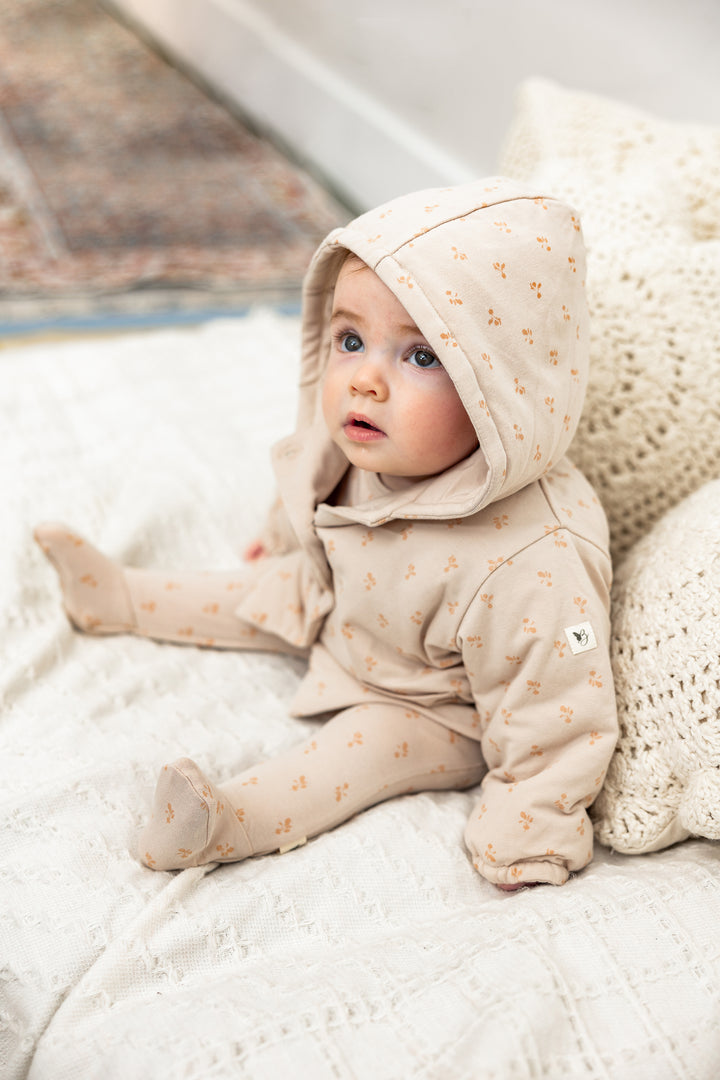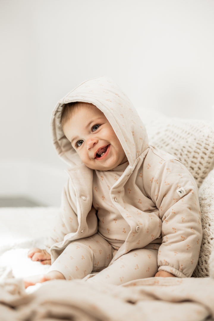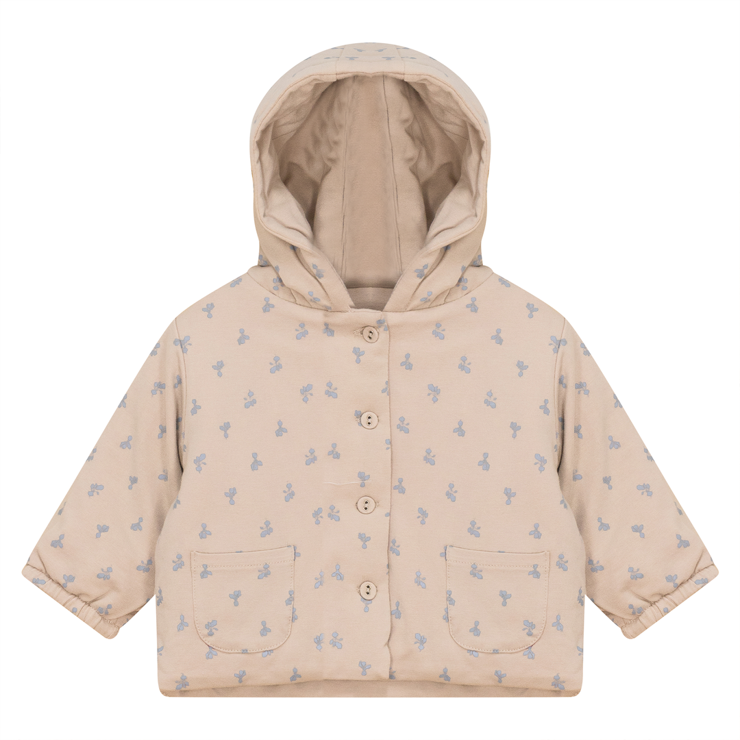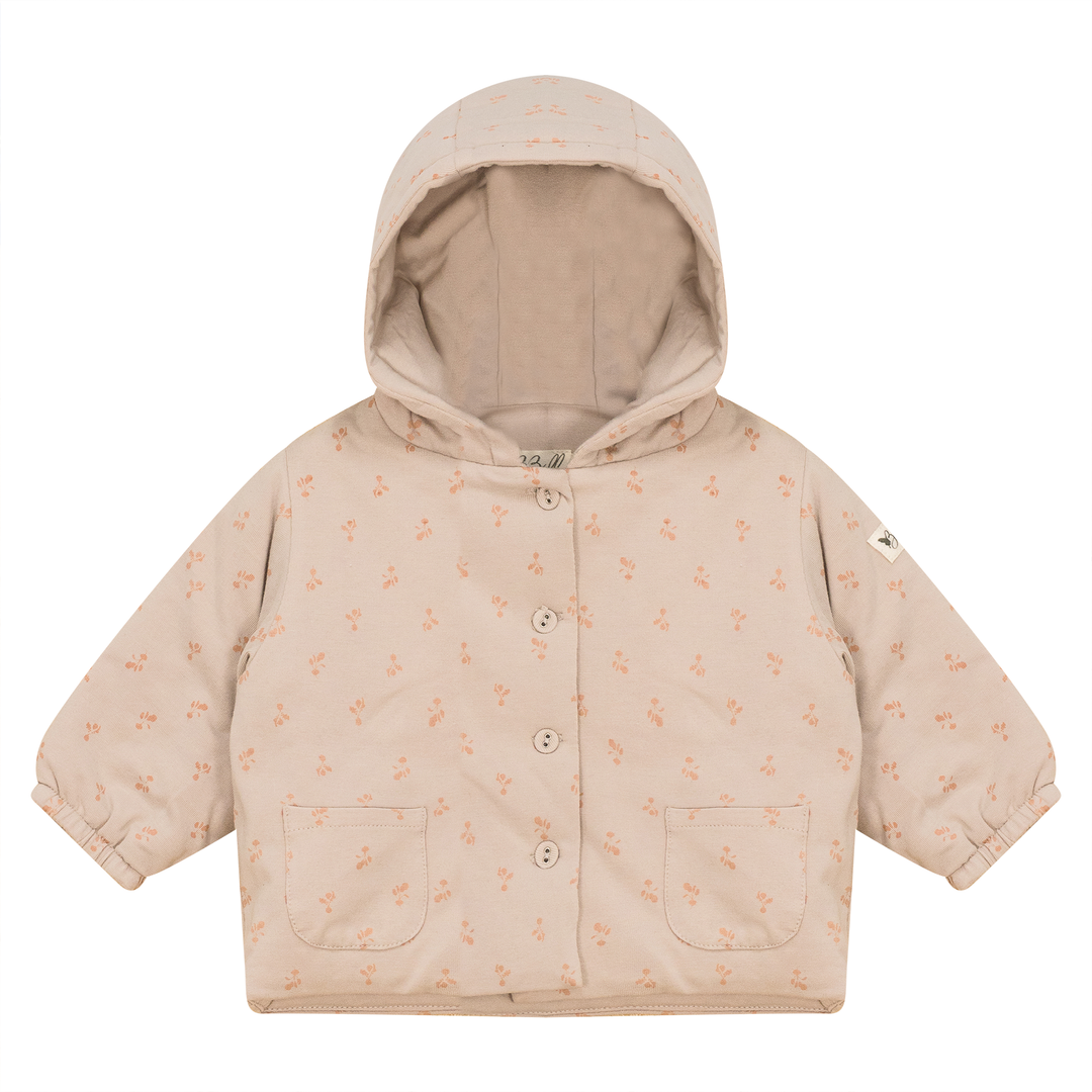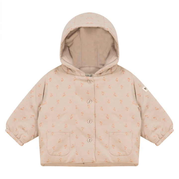 Baby boys and baby girls modal jersey allover radish printed jacket with center front buttonhole closure, elastic at cuffs and buttons. ֲ
