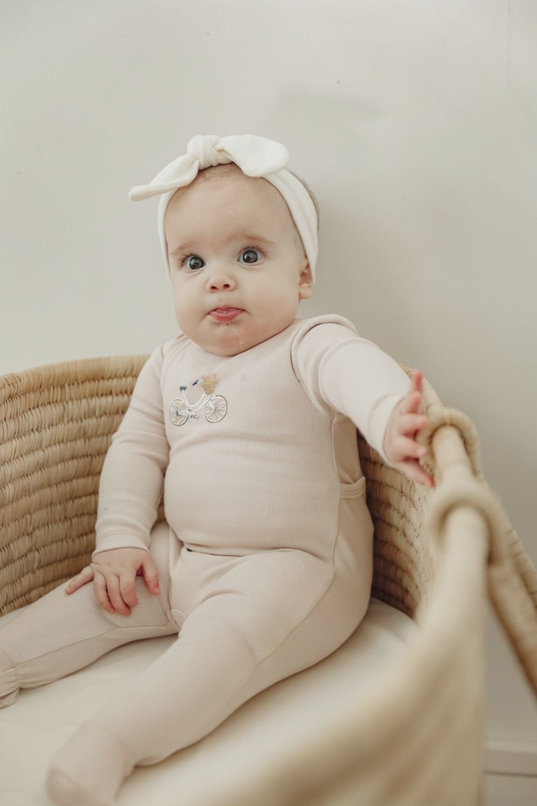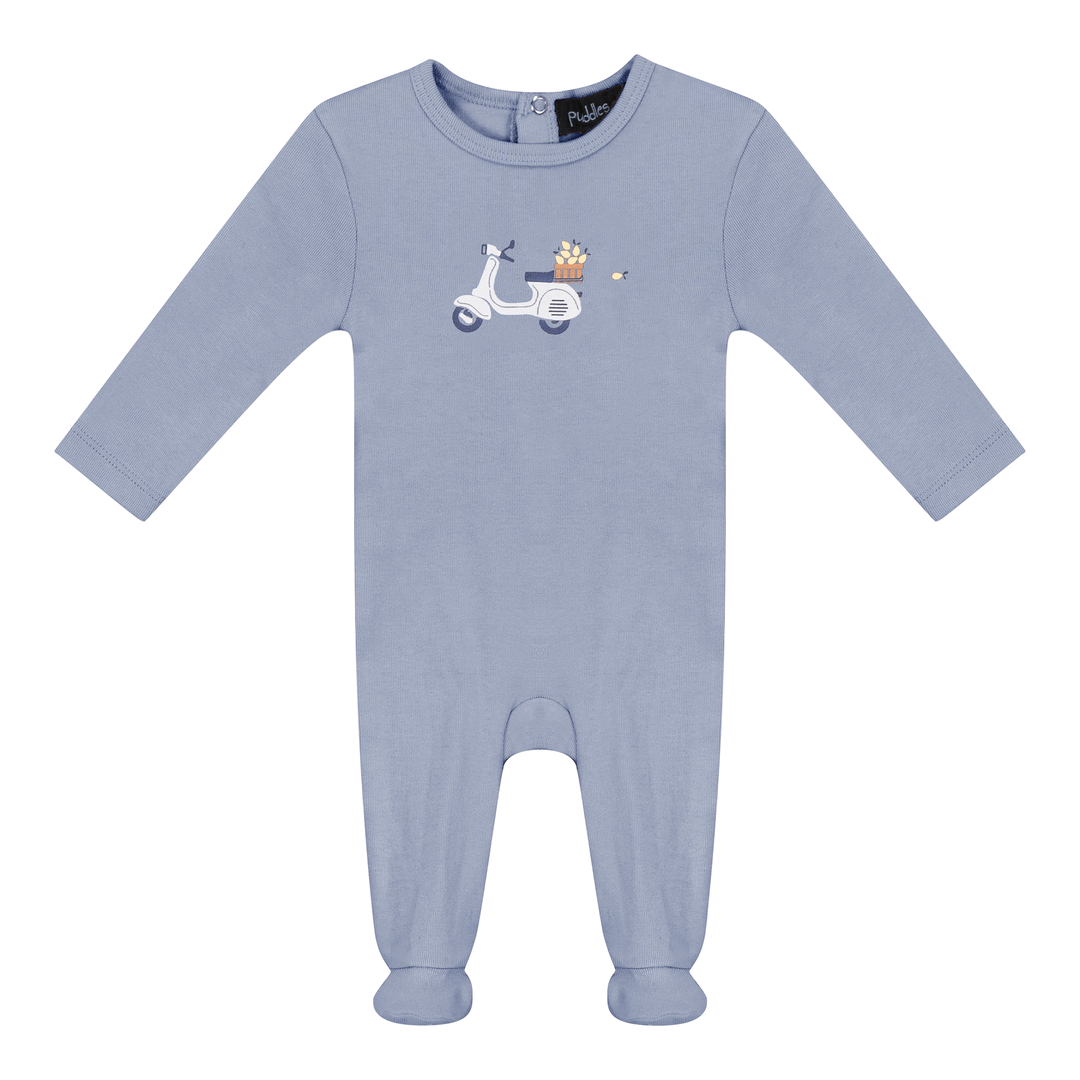 Baby boys and baby girls ribbed onesie with center front scooter and bicycle print ,center back snap opening and elastic at back ankle. ֲ